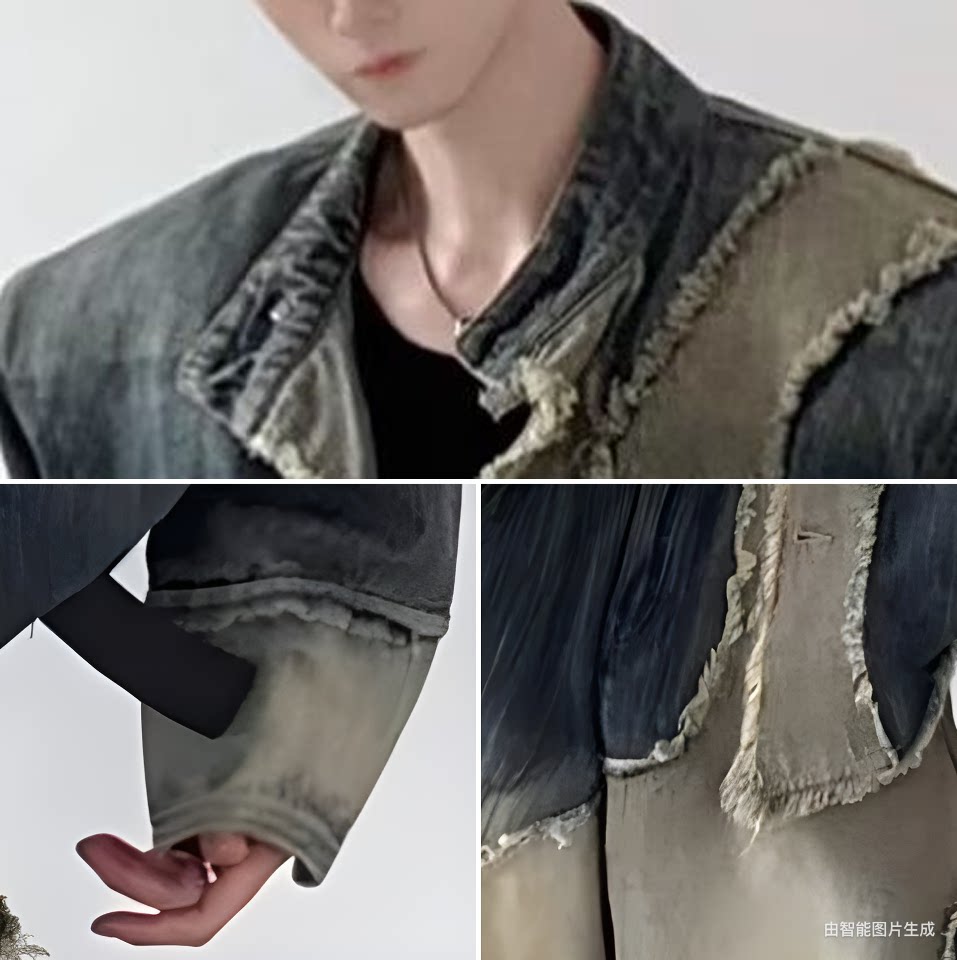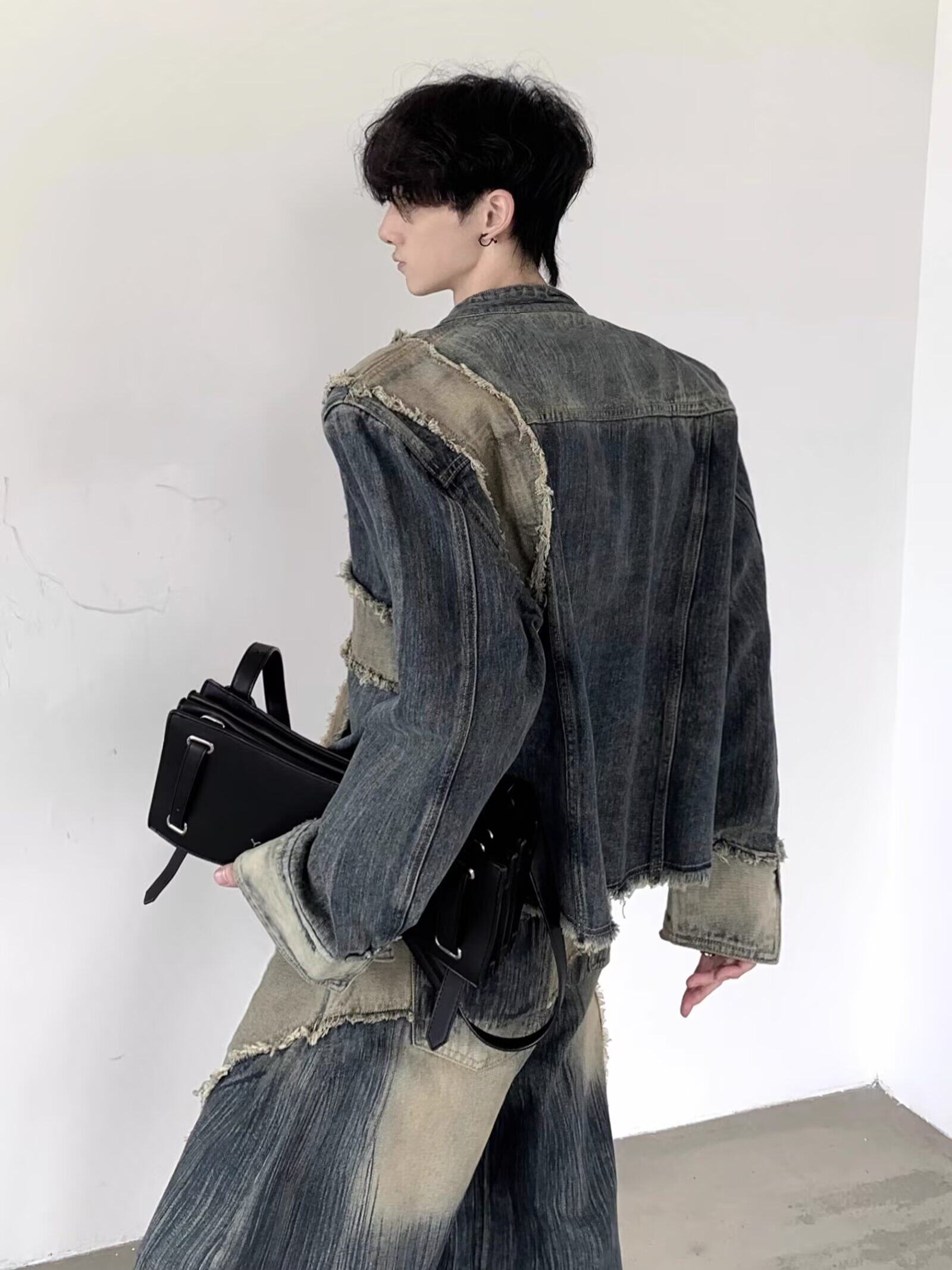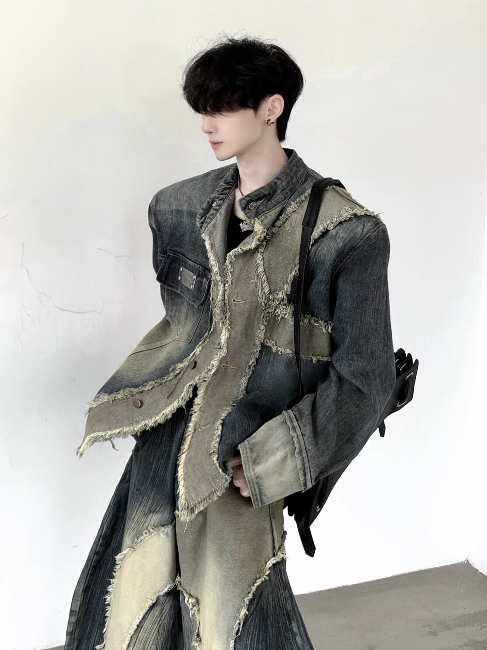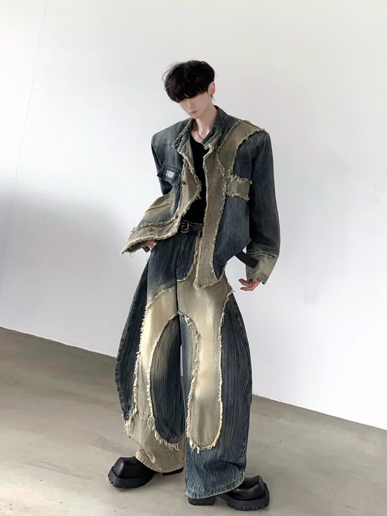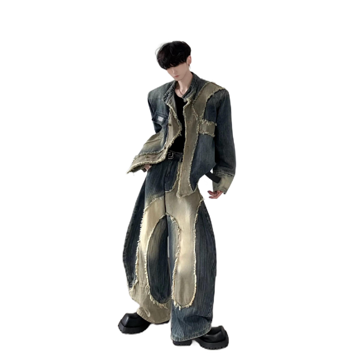 New Niche Post-Apocalyptic Style Heavy-Duty Patchwork Frayed Design Denim Jacket Men's Scimitar Wide-Leg Pants Set Trendy