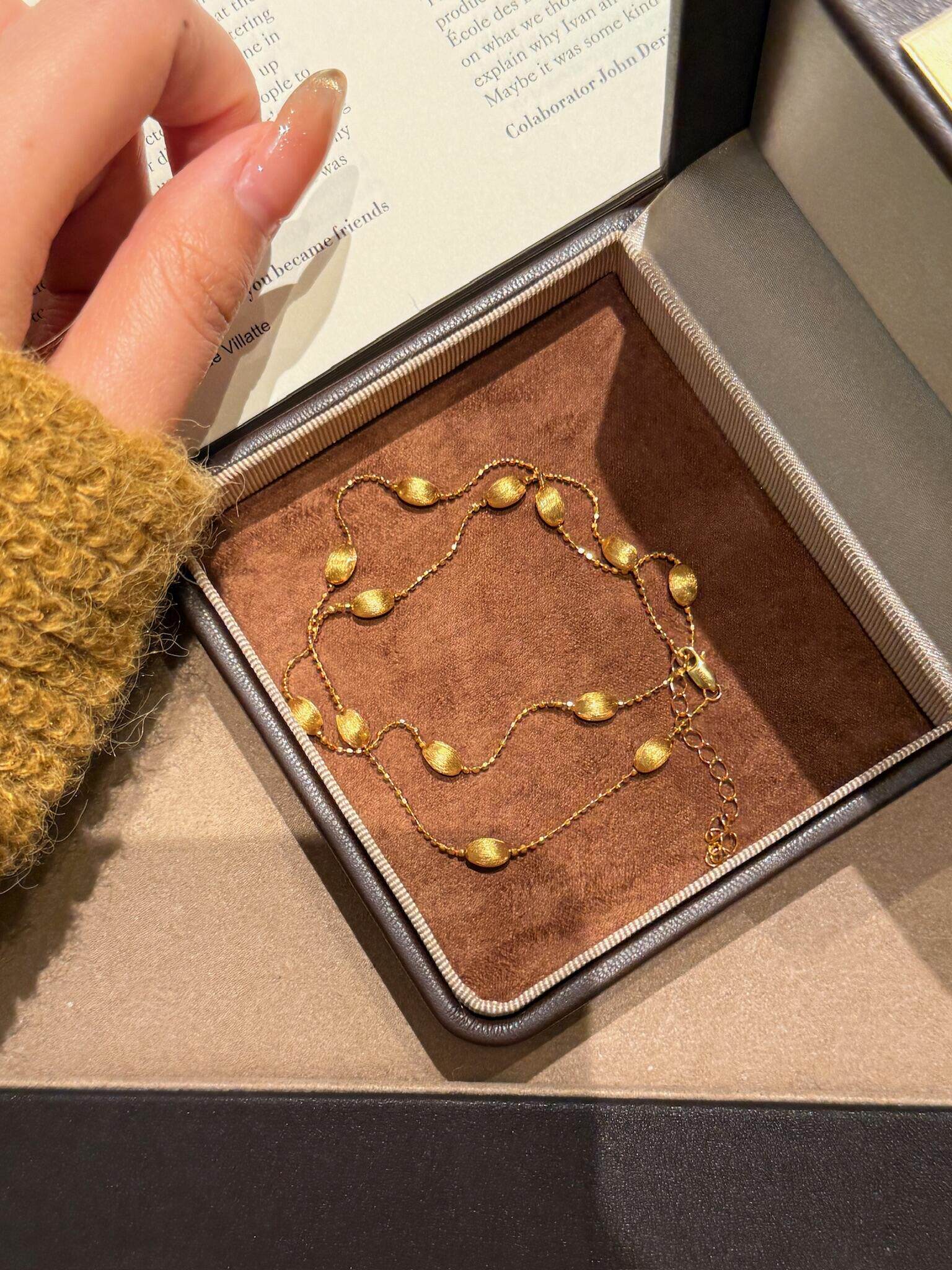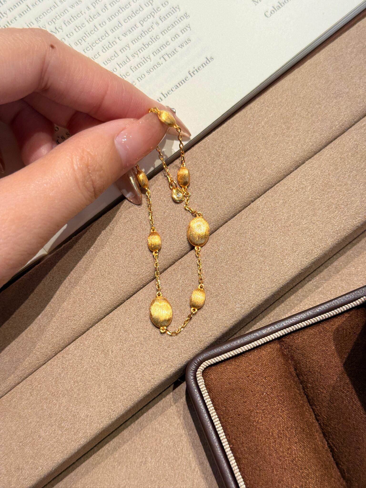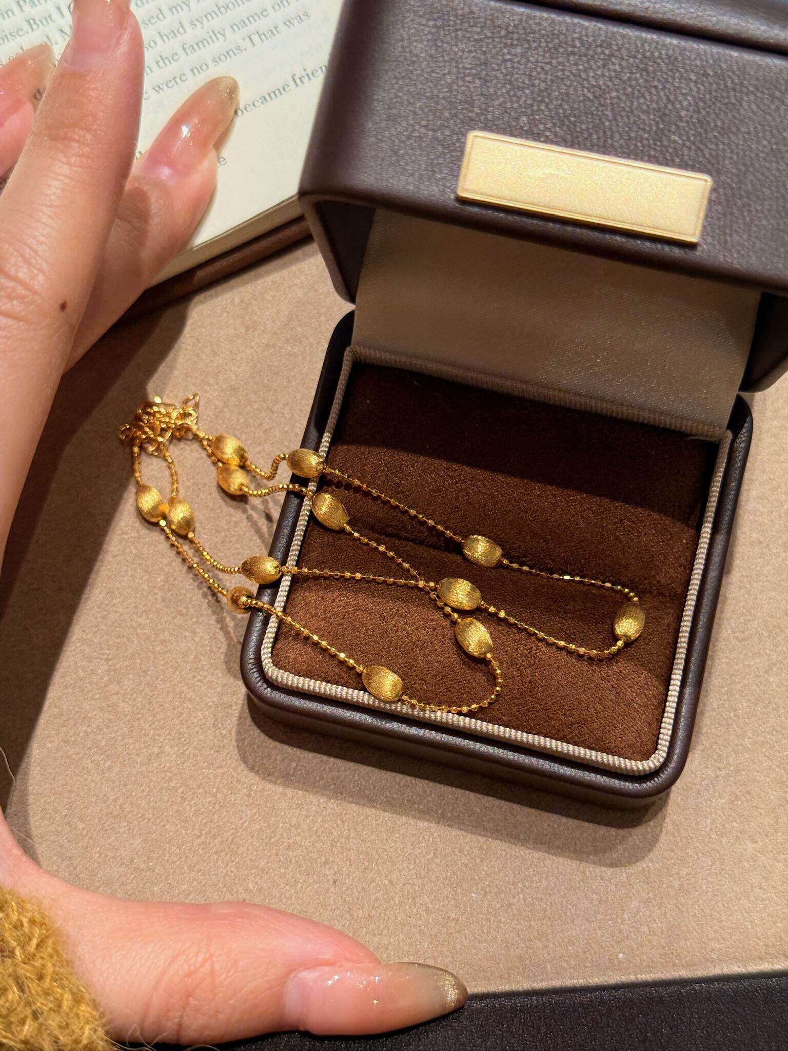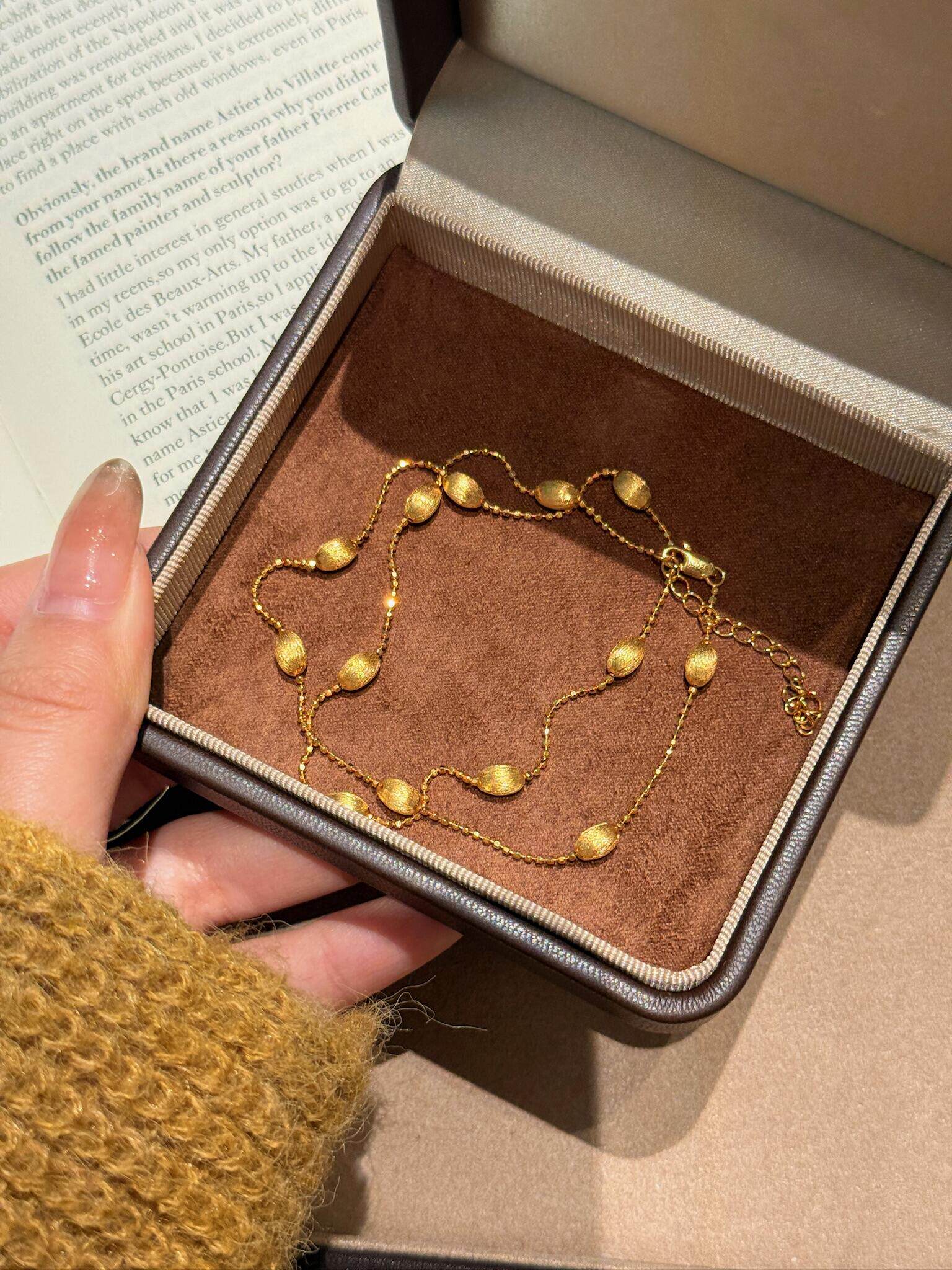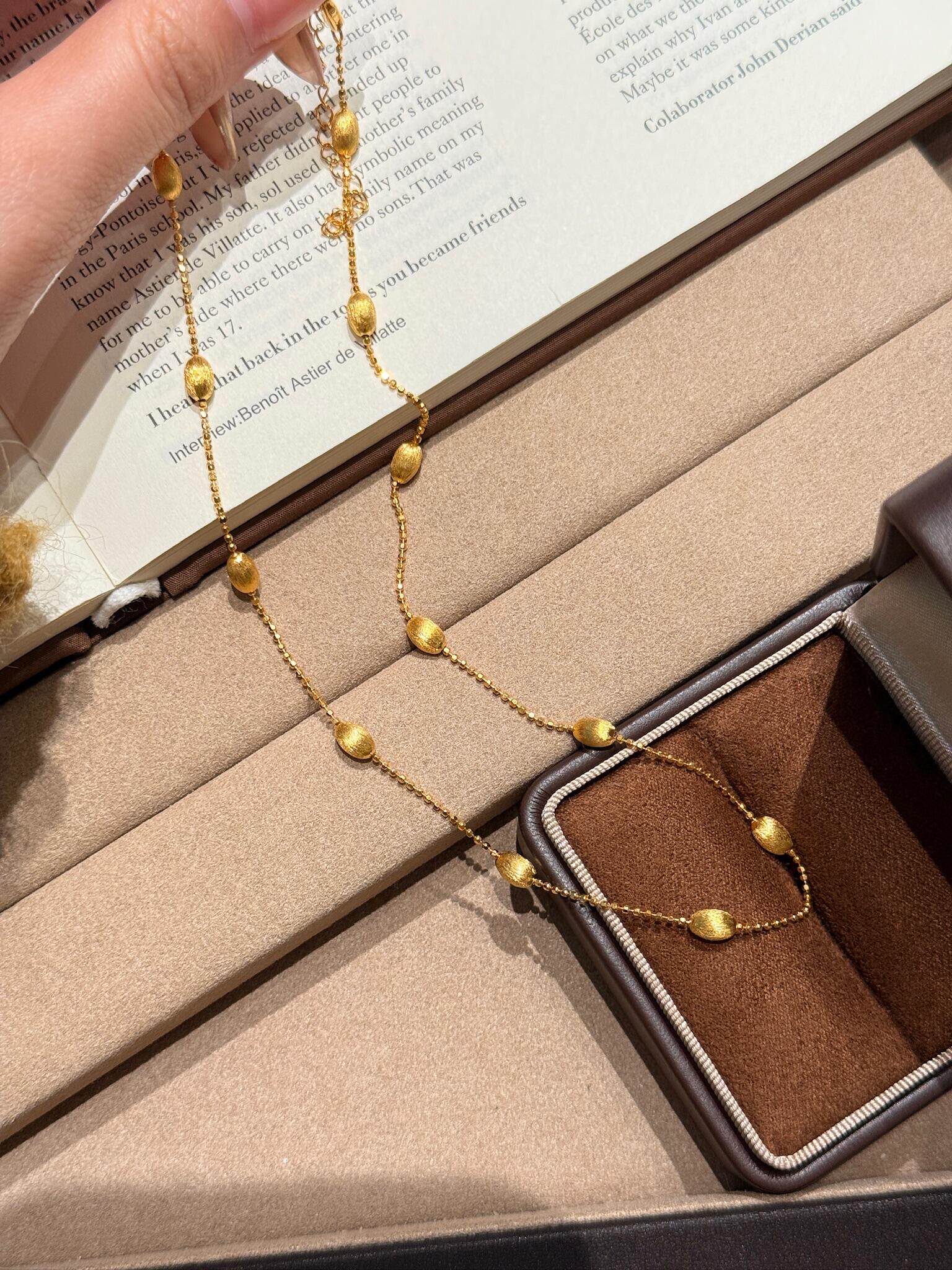S925 Sterling Silver! Brushed Olive Bead Necklace and Bracelet Set, Gold Bean French Light Luxury Long and Short Necklace and Bracelet