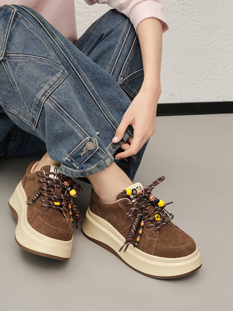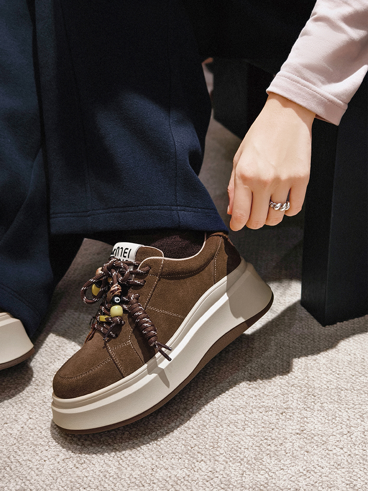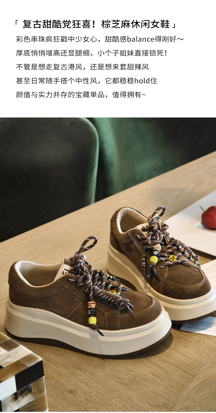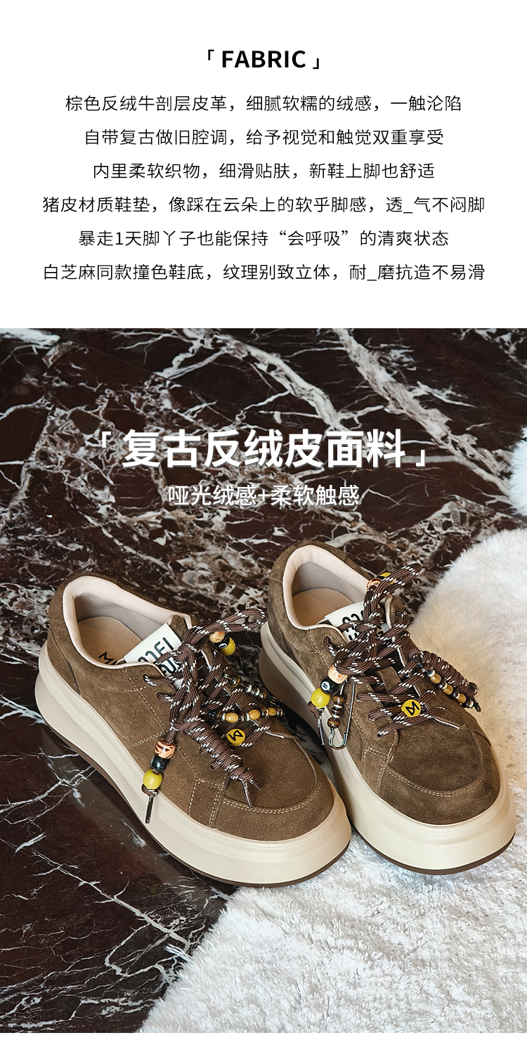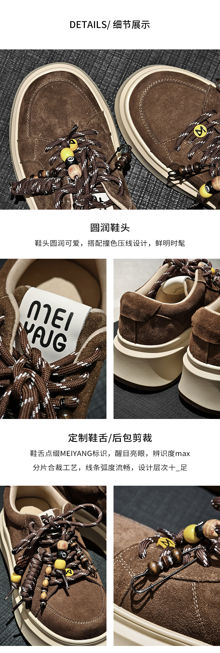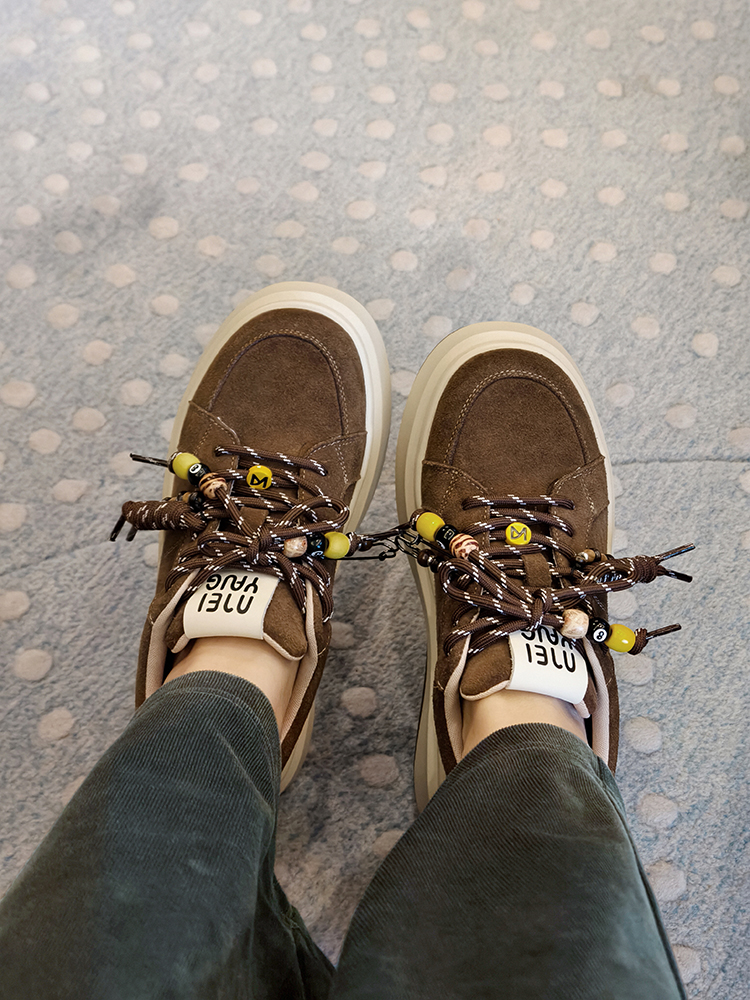 Meiyang Brown Sesame Casual Shoes Cow Suede_ Vintage Sweet Cool Round Toe Color-Block Beaded Decoration Thick Sole