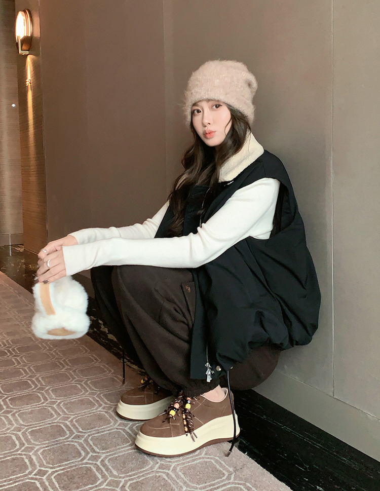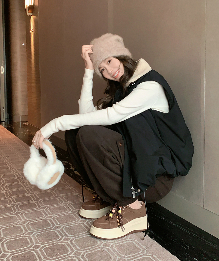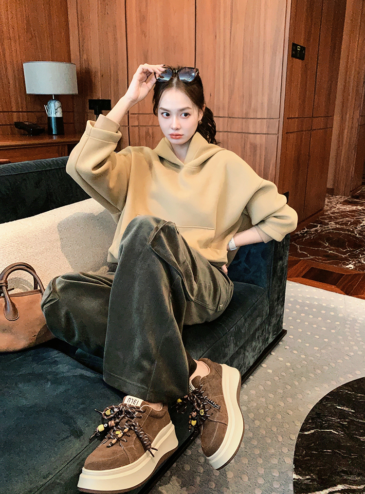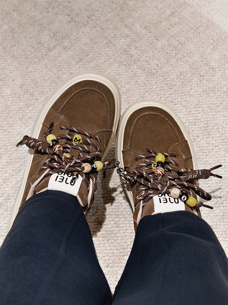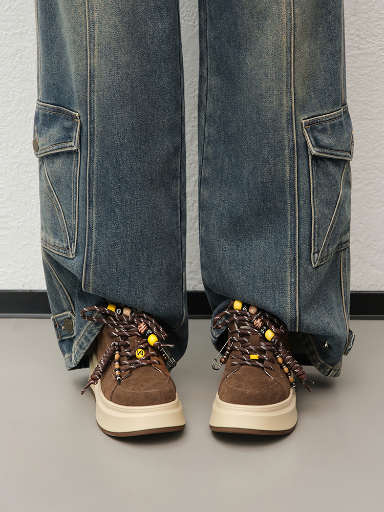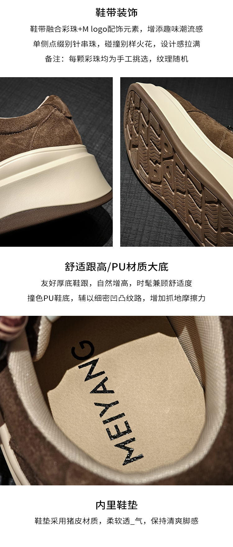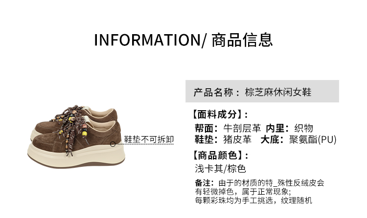Meiyang Brown Sesame Casual Shoes Cow Suede_ Vintage Sweet Cool Round Toe Color-Block Beaded Decoration Thick Sole