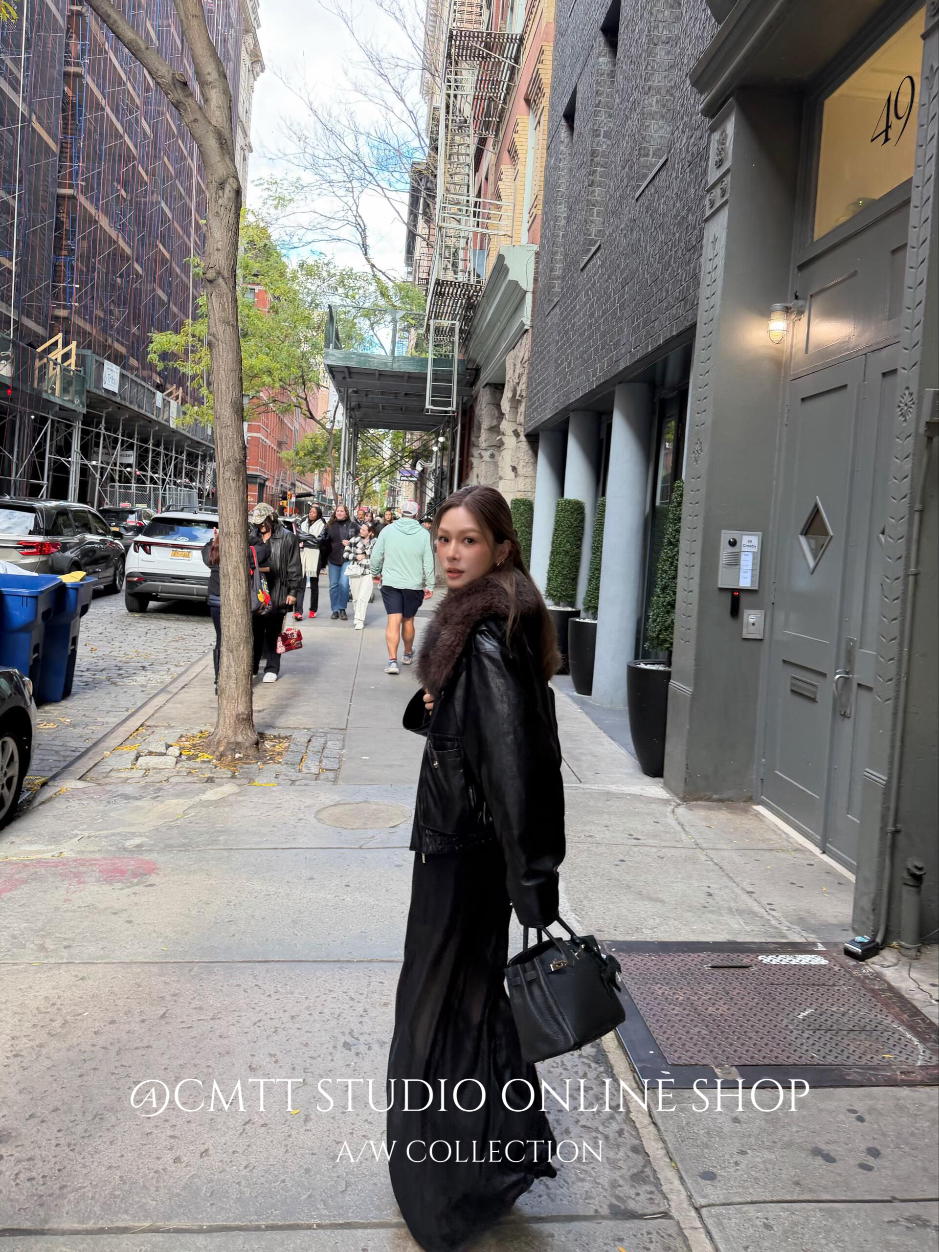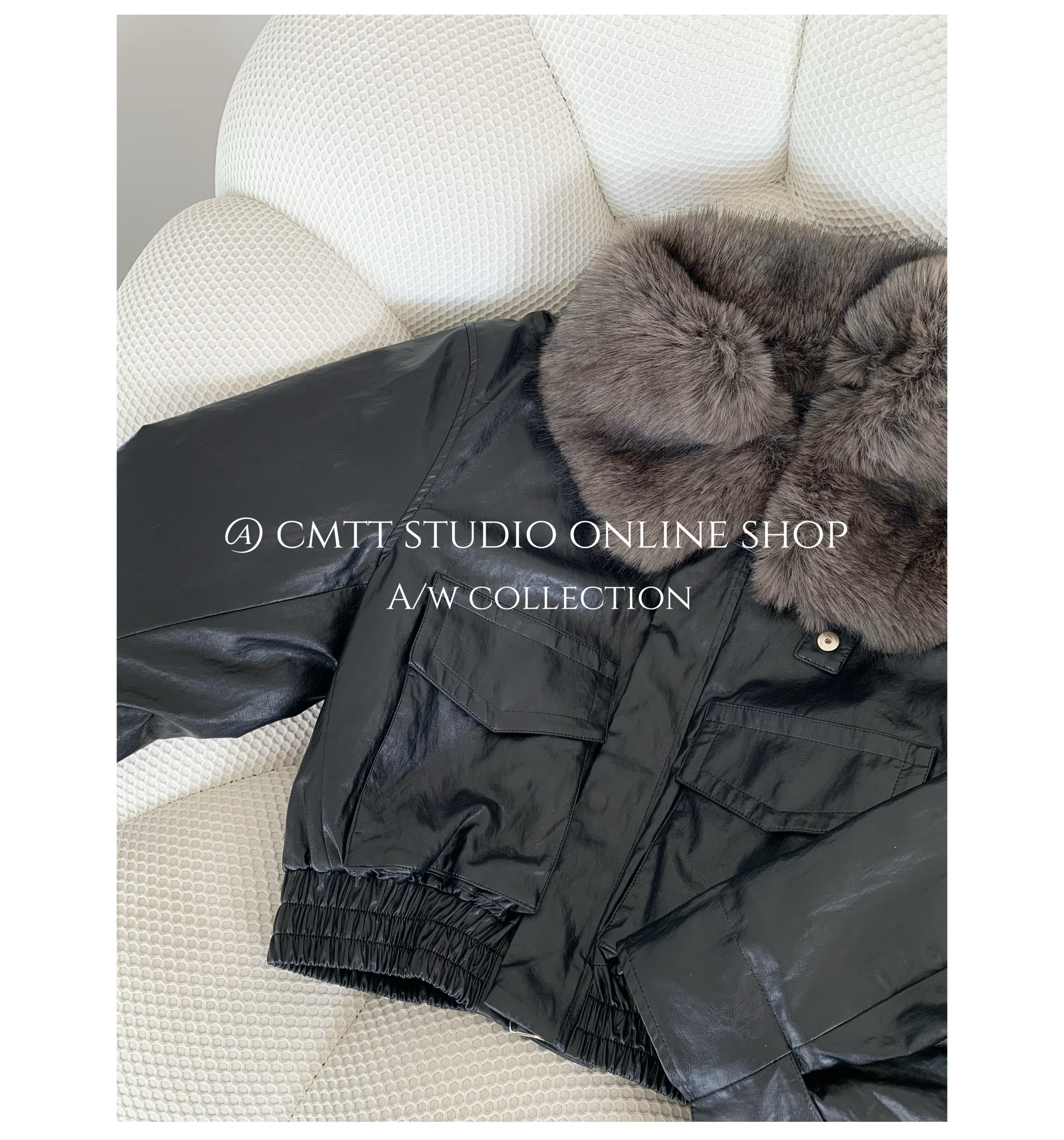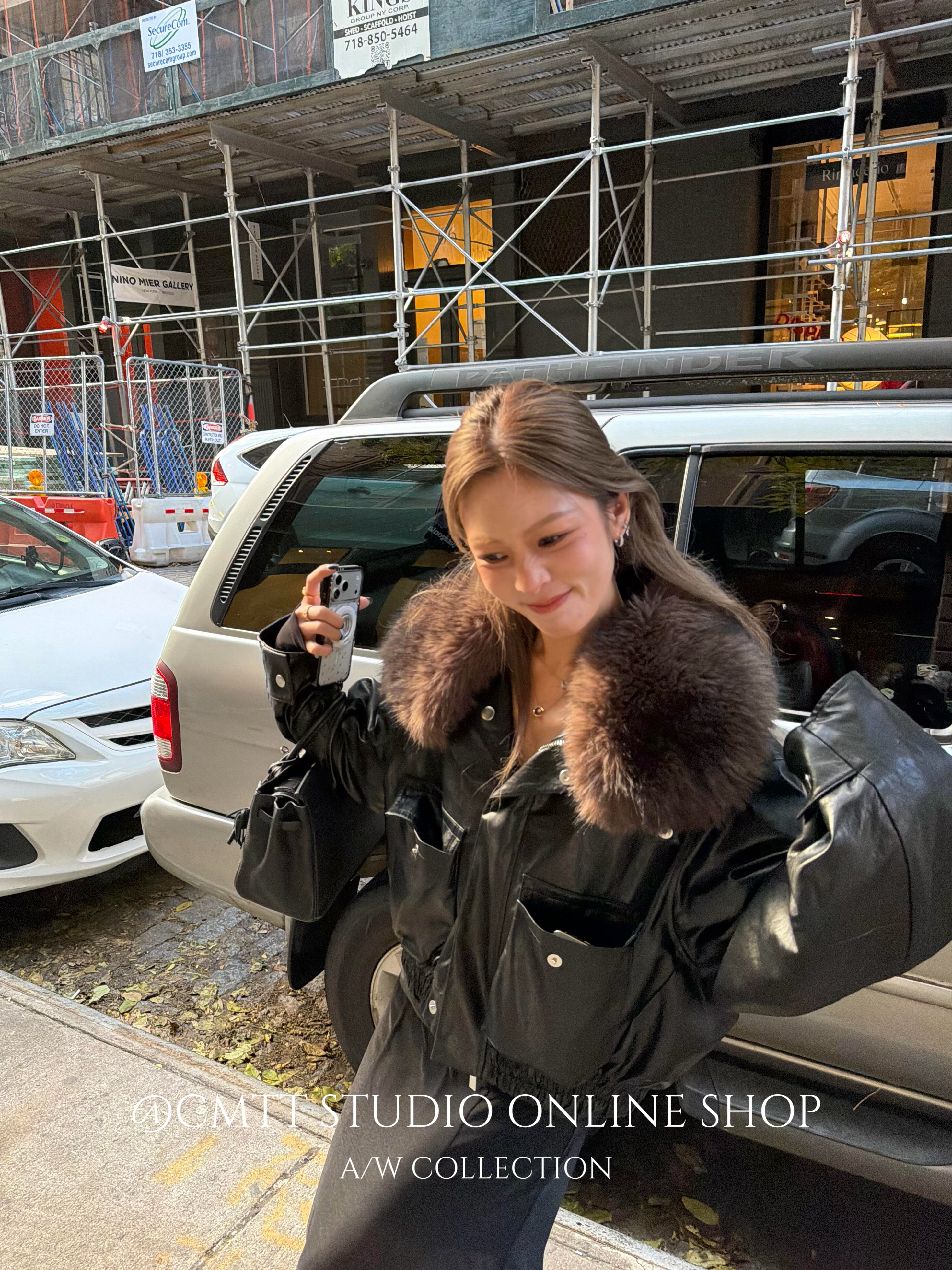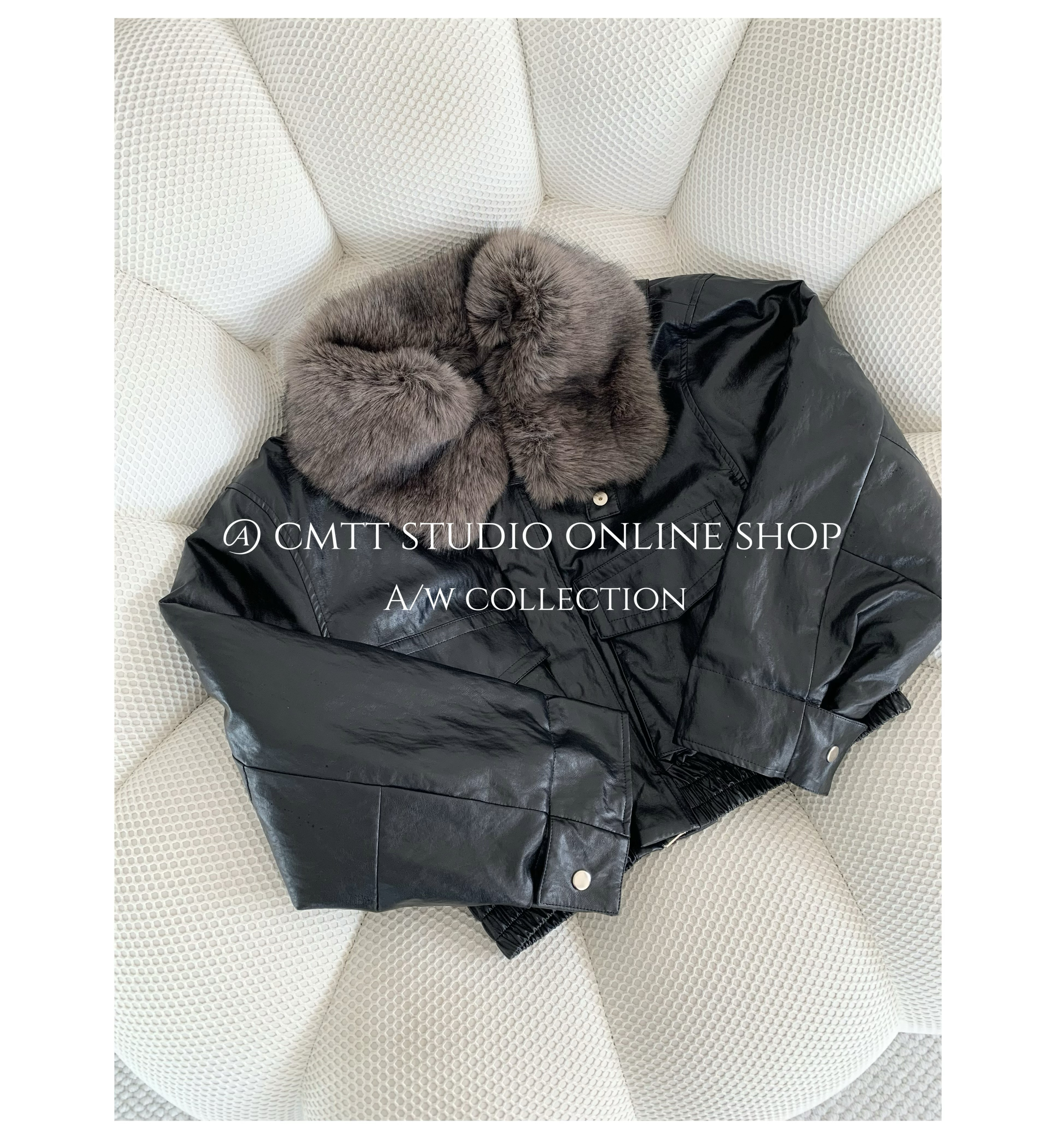 (Now) Nana's Same Style Fax Niche Design Adventure Black Fur Collar Leather-Feel Padded Jacket Leather Coat