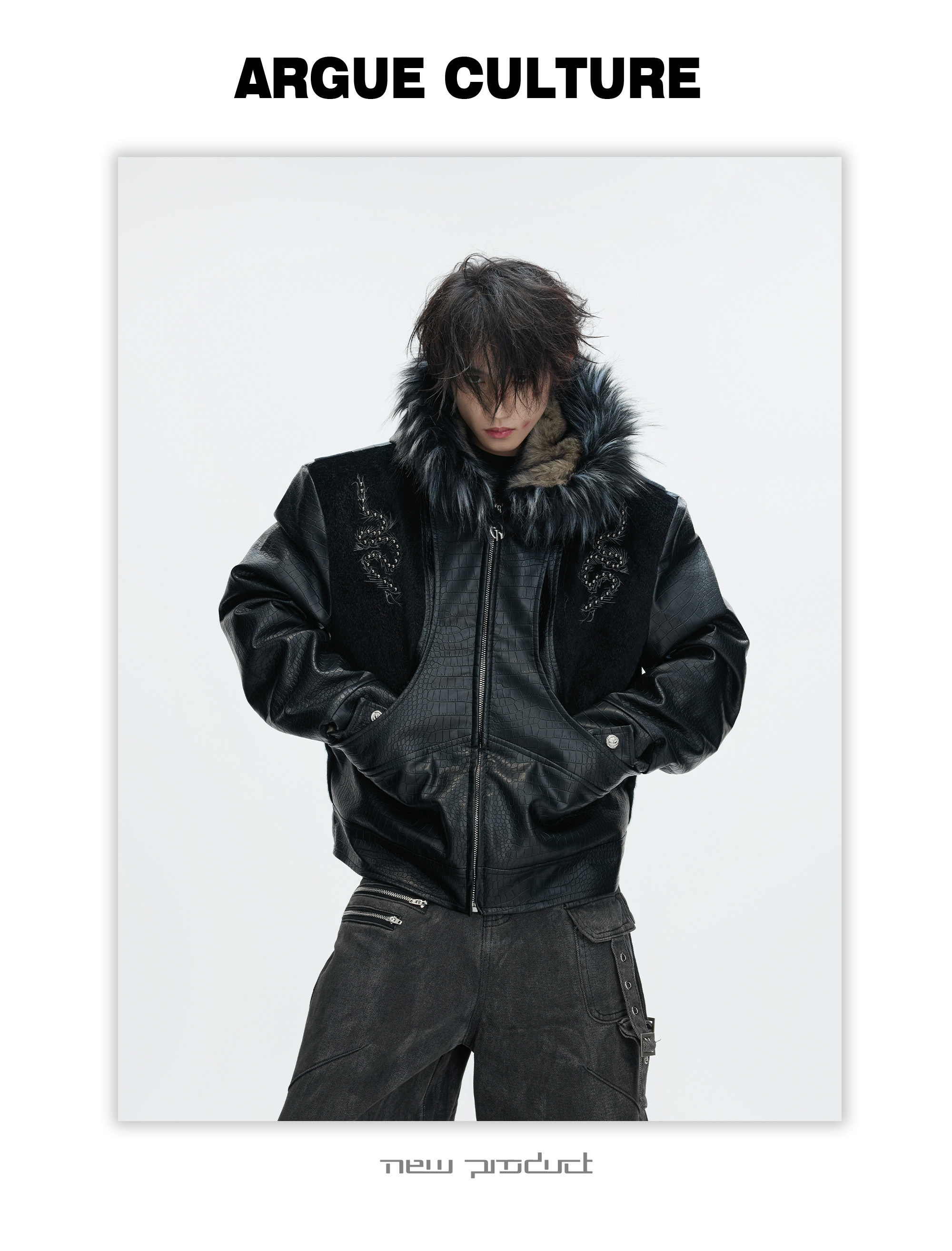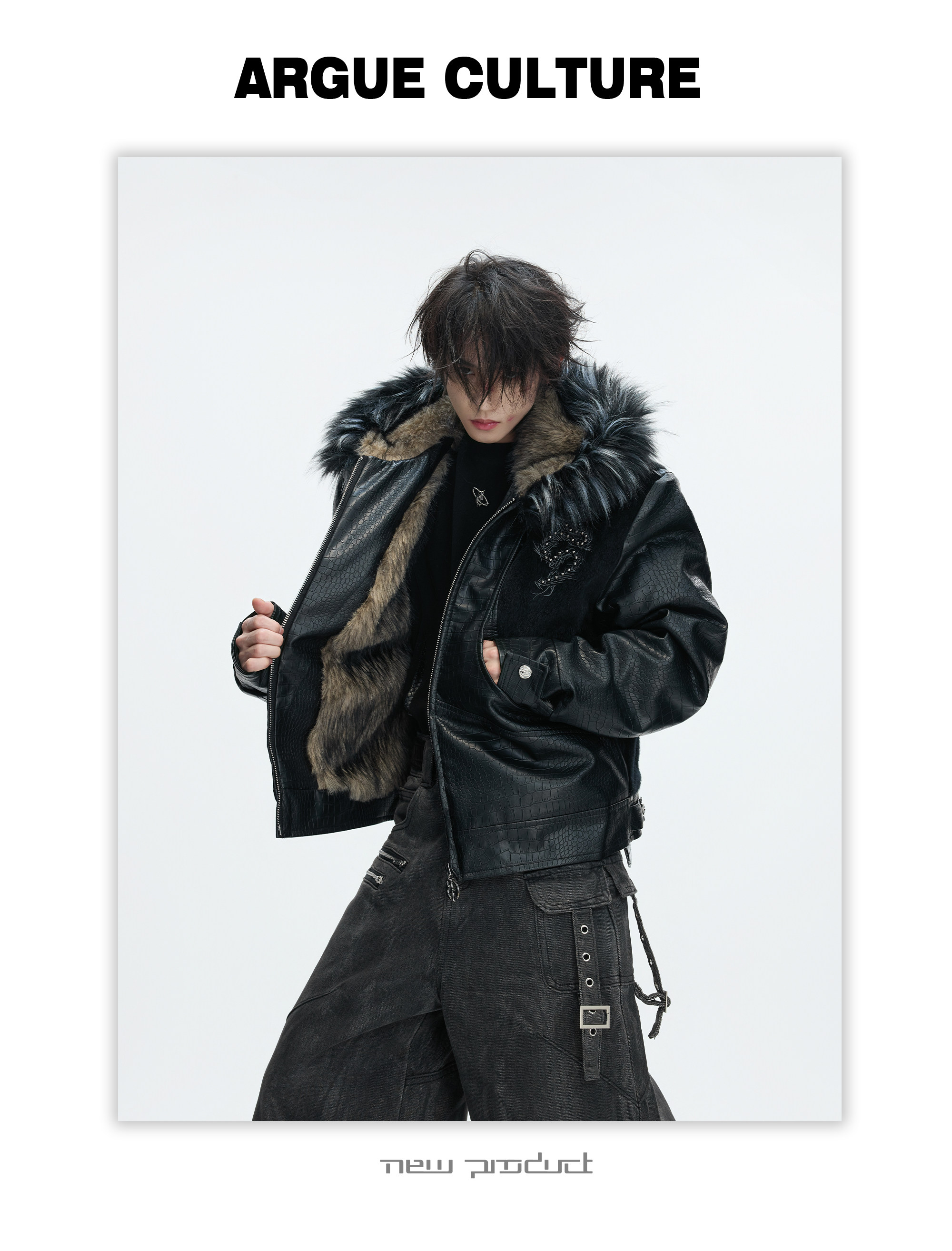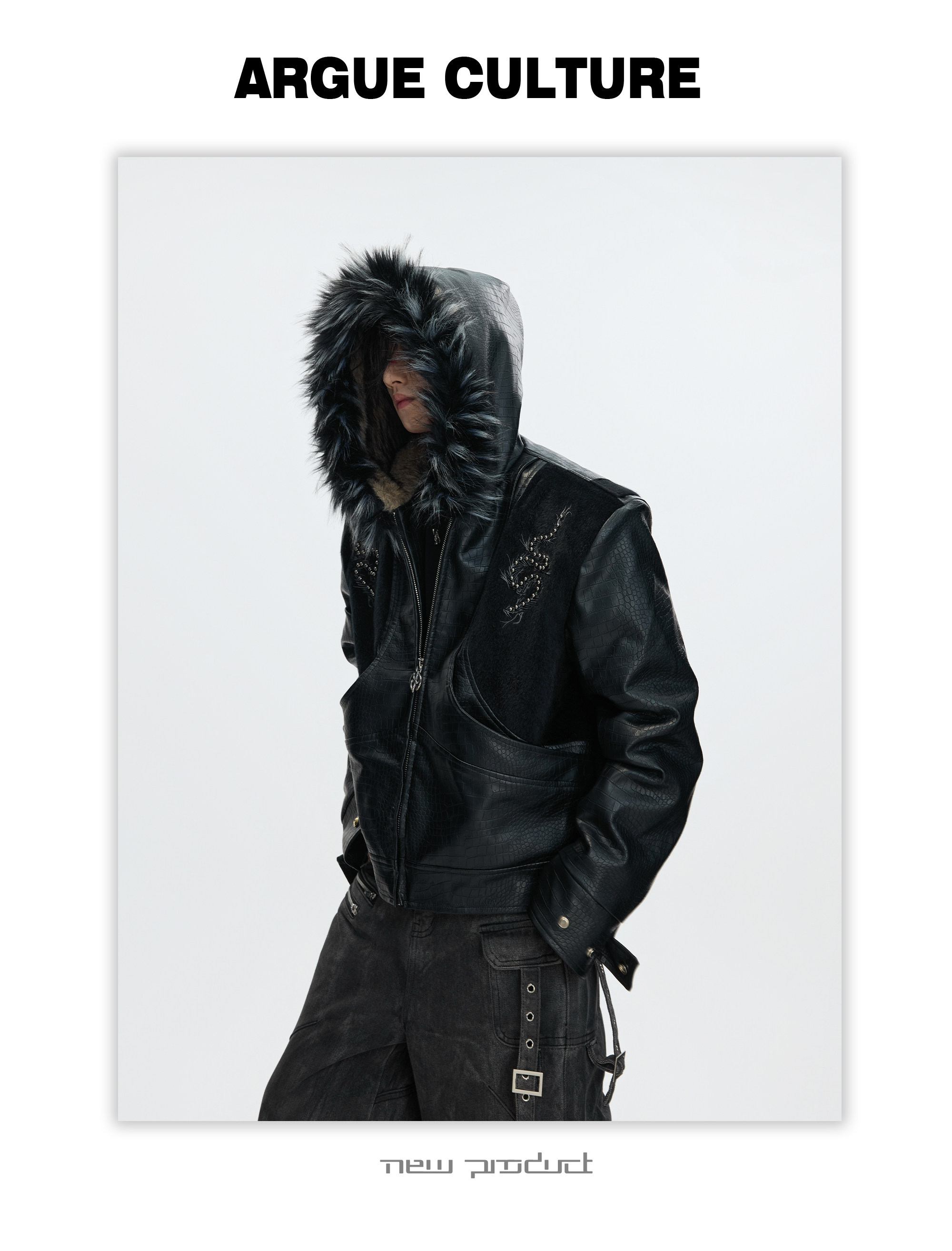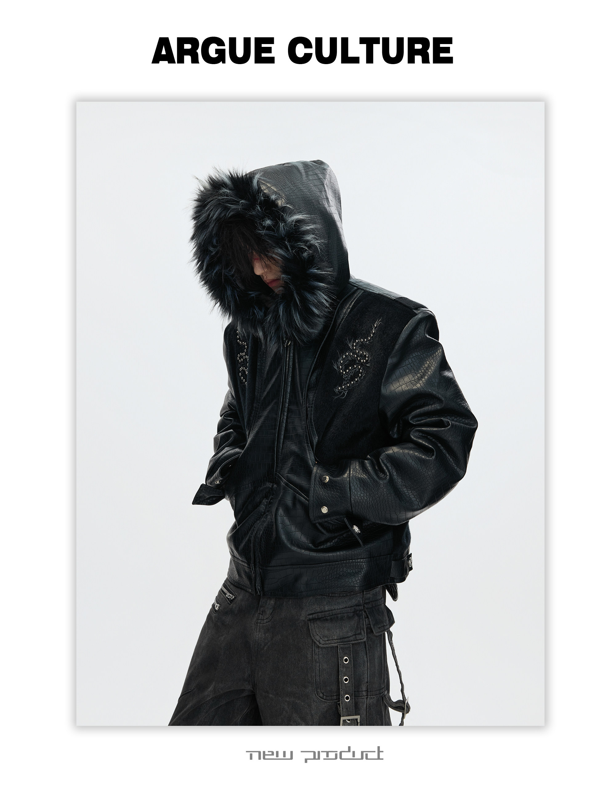 Argueculture Shadow* Horsehair Crocodile Pattern Hooded Mountain Carving Fleece-Lined Thickened Cotton Jacket Coat