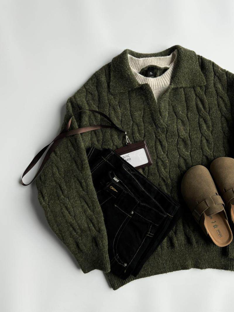 Old Money Style Green Cable Knit Lapel Sweater for Men, Autumn and Winter Casual Knitwear Jacket, Warm Faux Two-Piece Base Shirt