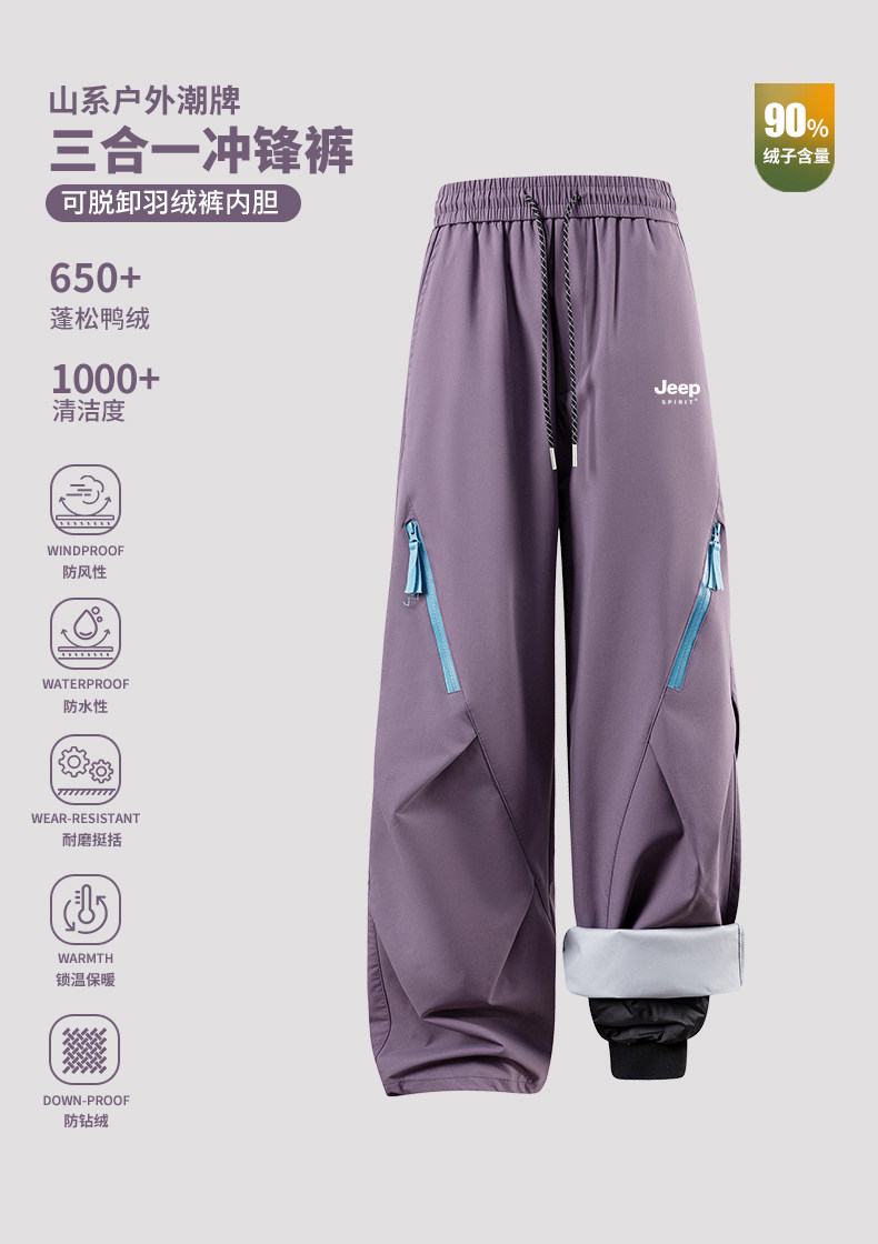 Jeep Three-In-One Softshell down Pants for Men and Women, Winter Waterproof and Windproof Hiking and Mountaineering Cargo Pants, Detachable