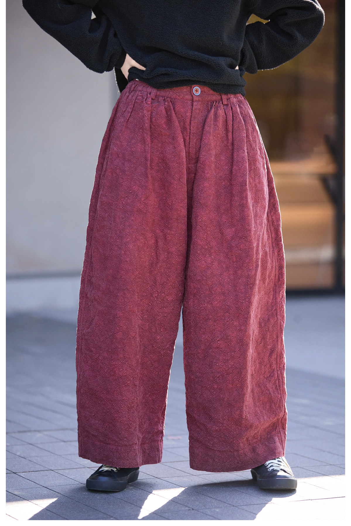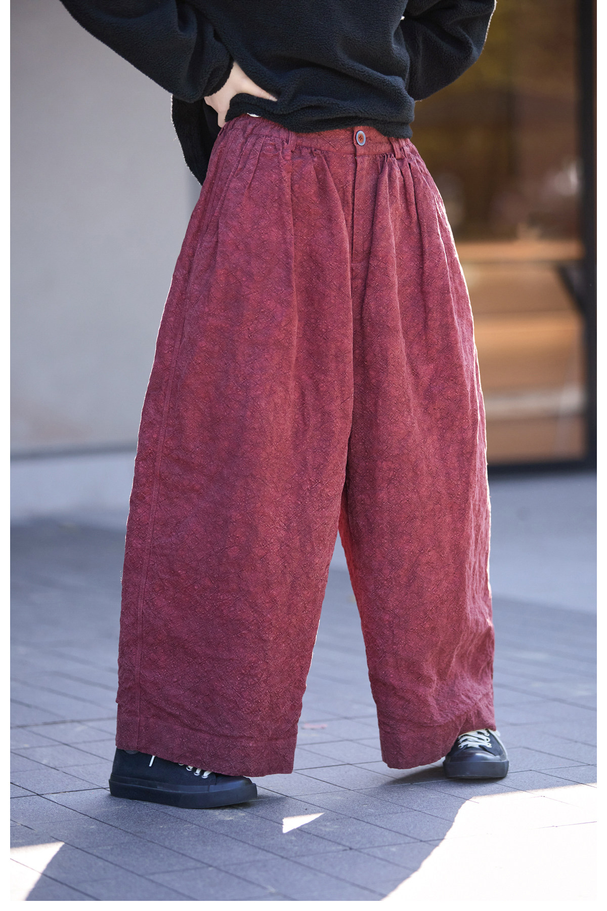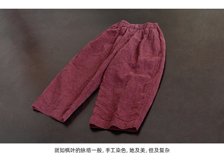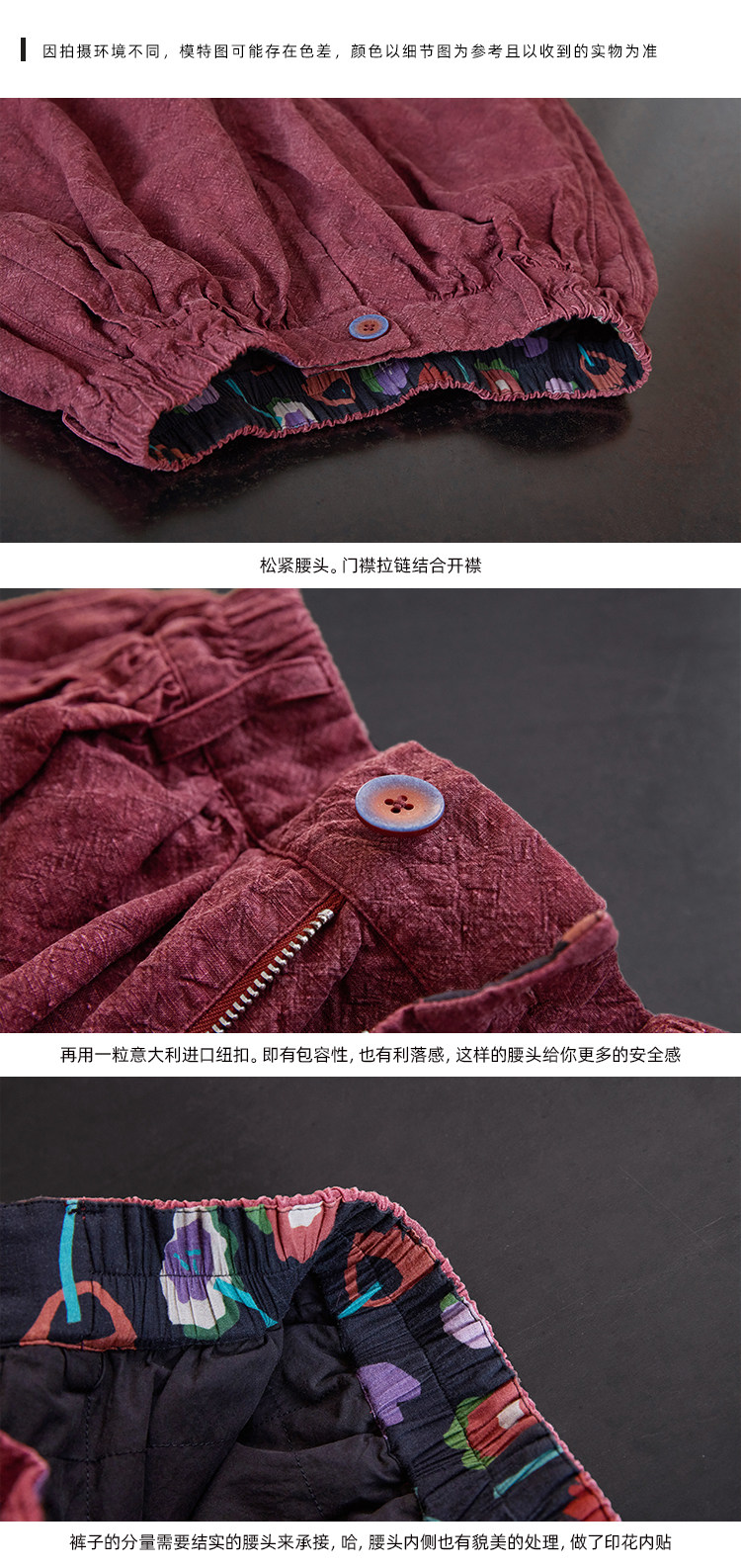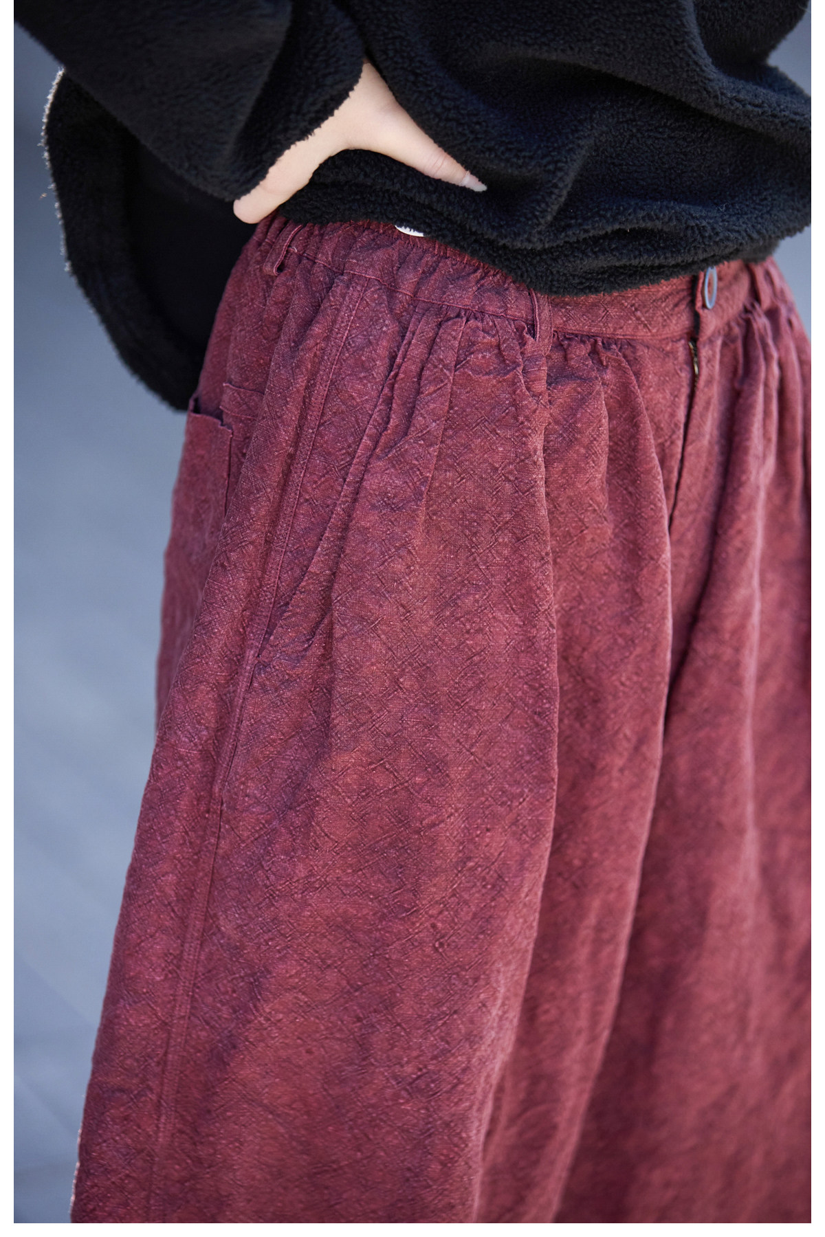 Original [Folk Art] Winter Style Burgundy High-Density Linen Warm Slimming Elastic Waist Cotton Pants 7330-4
