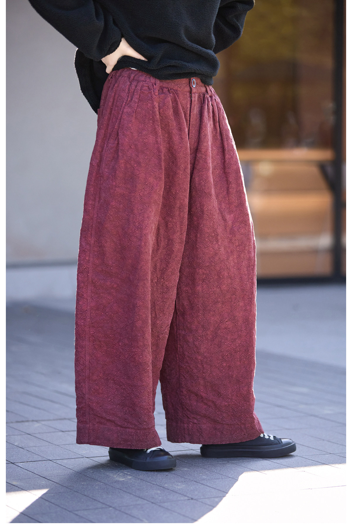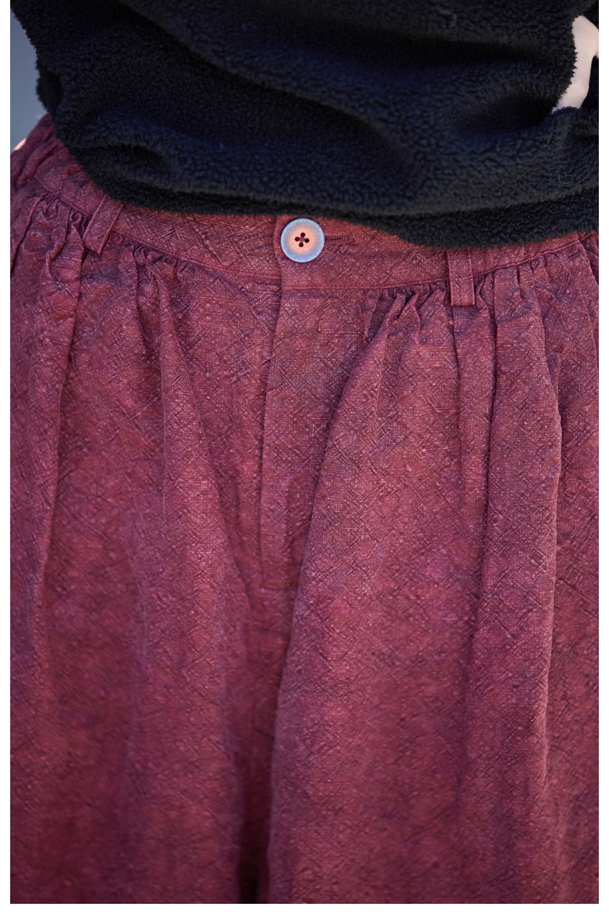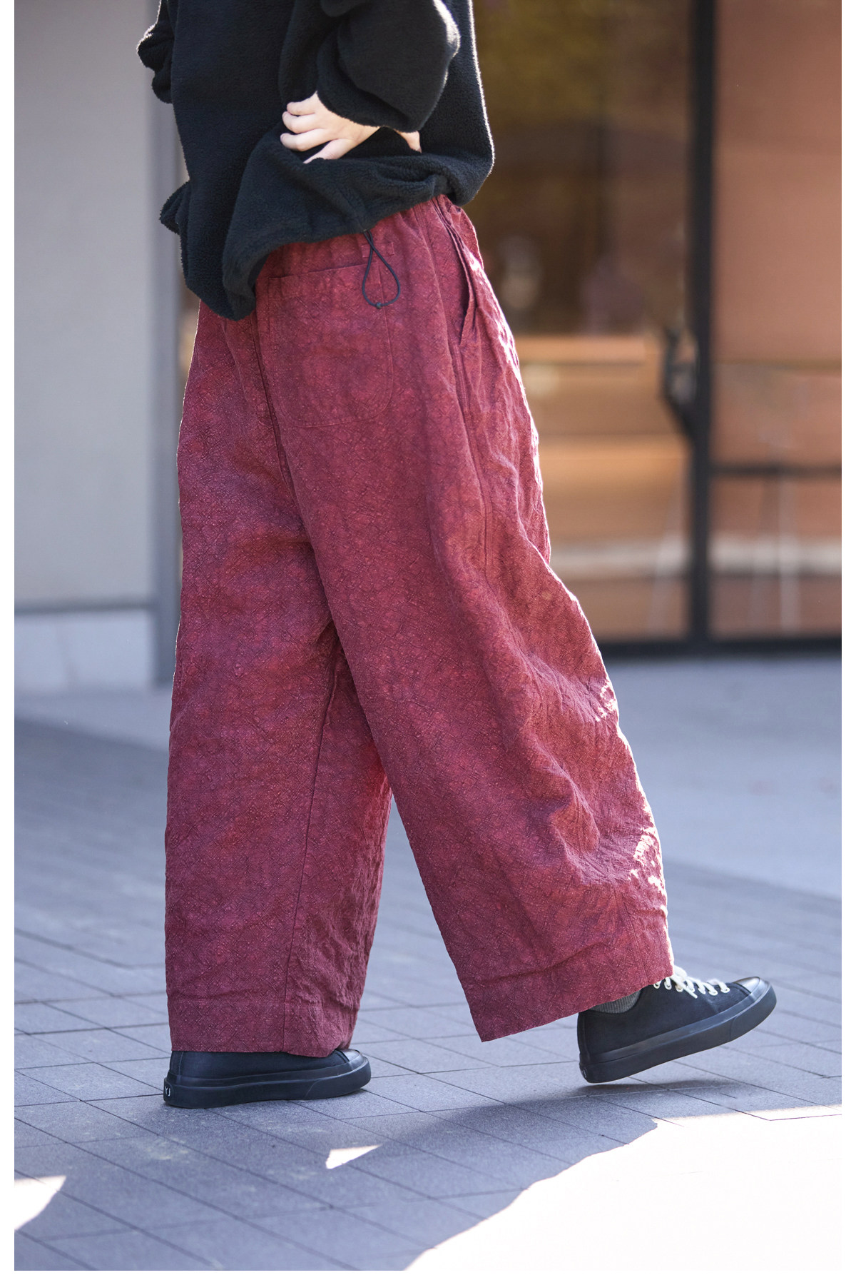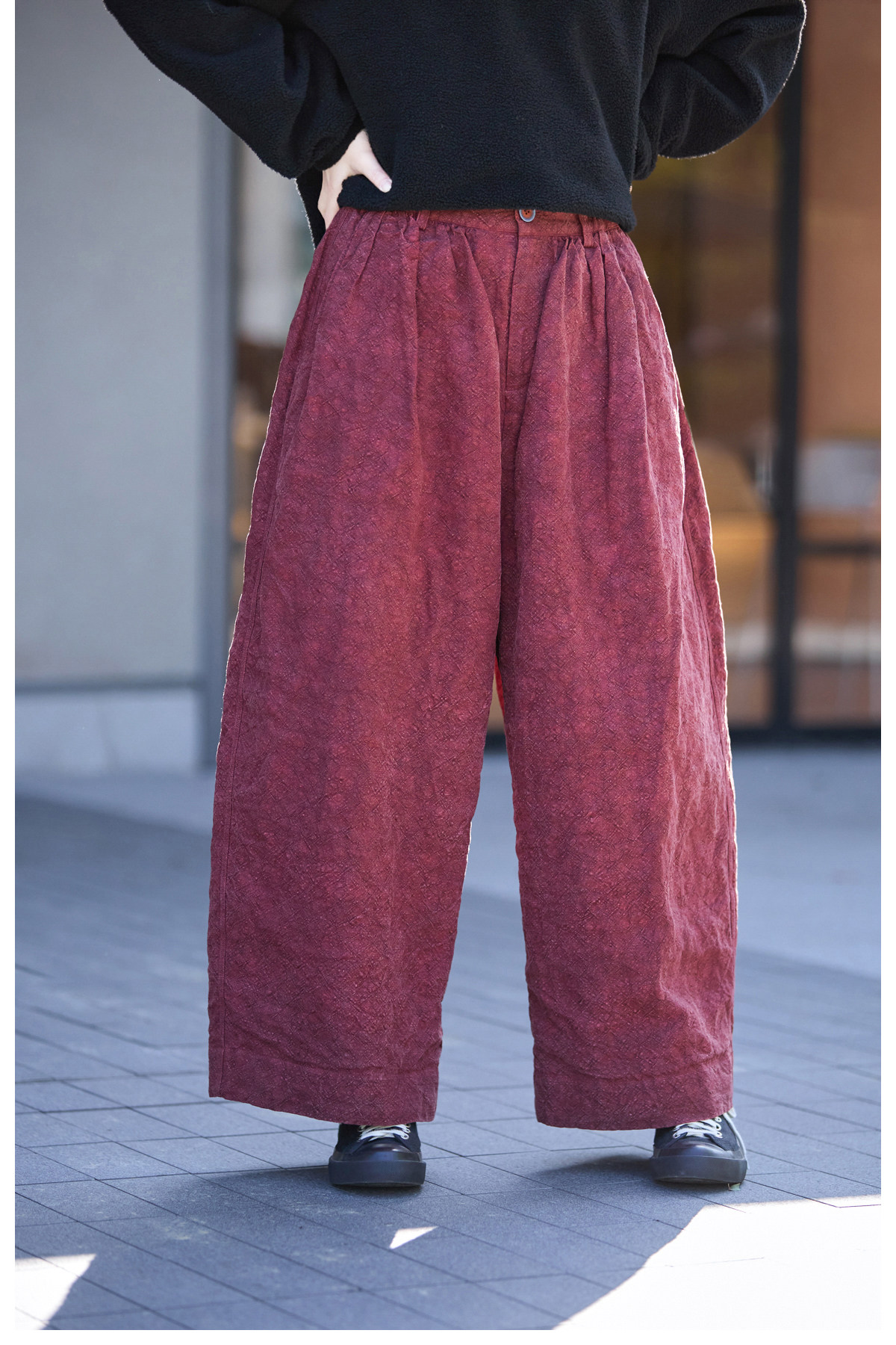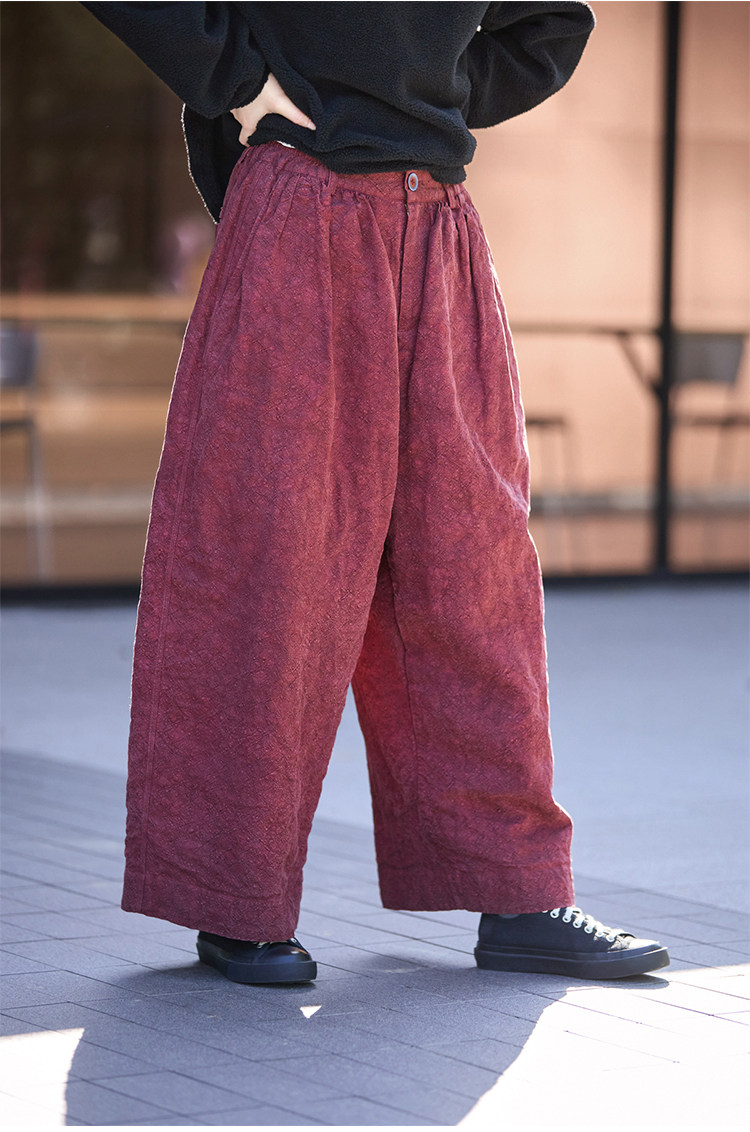 Original [Folk Art] Winter Style Burgundy High-Density Linen Warm Slimming Elastic Waist Cotton Pants 7330-4