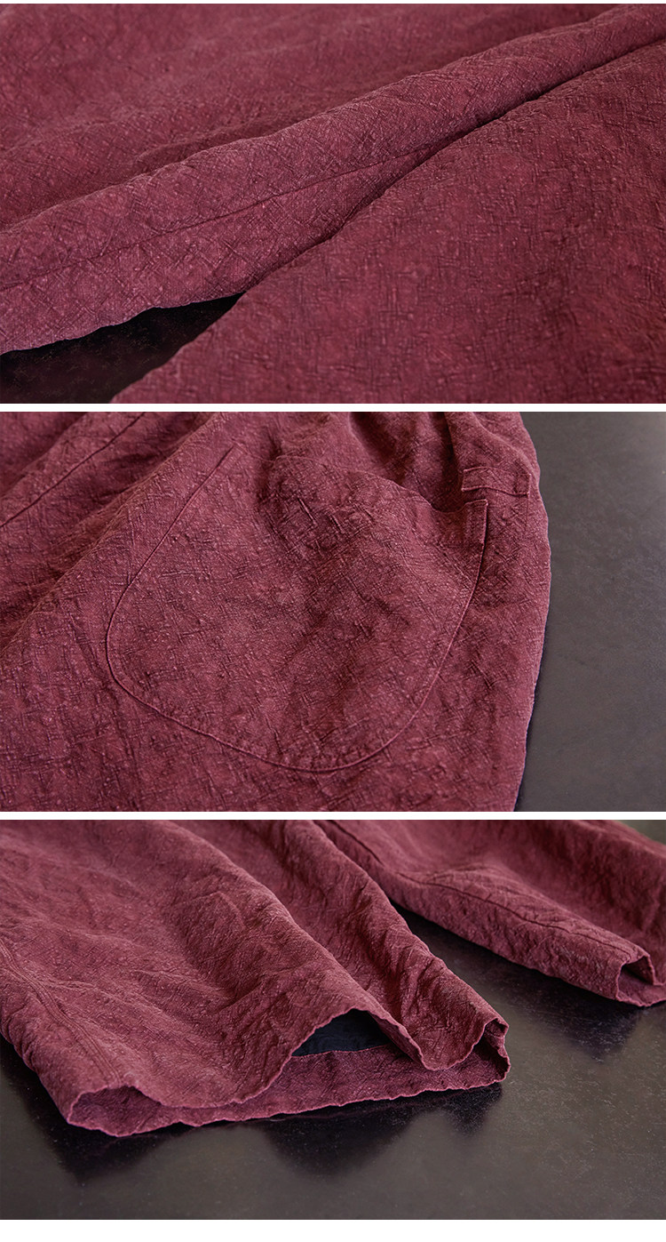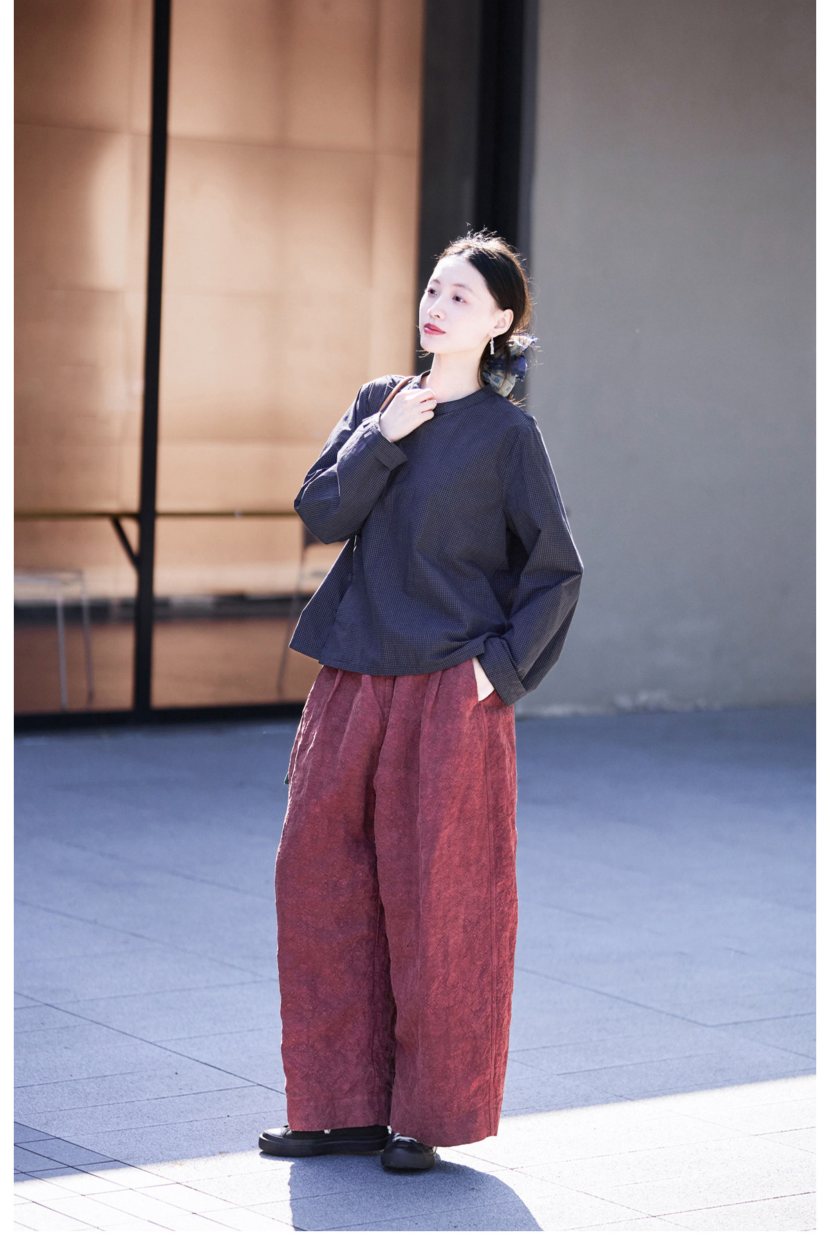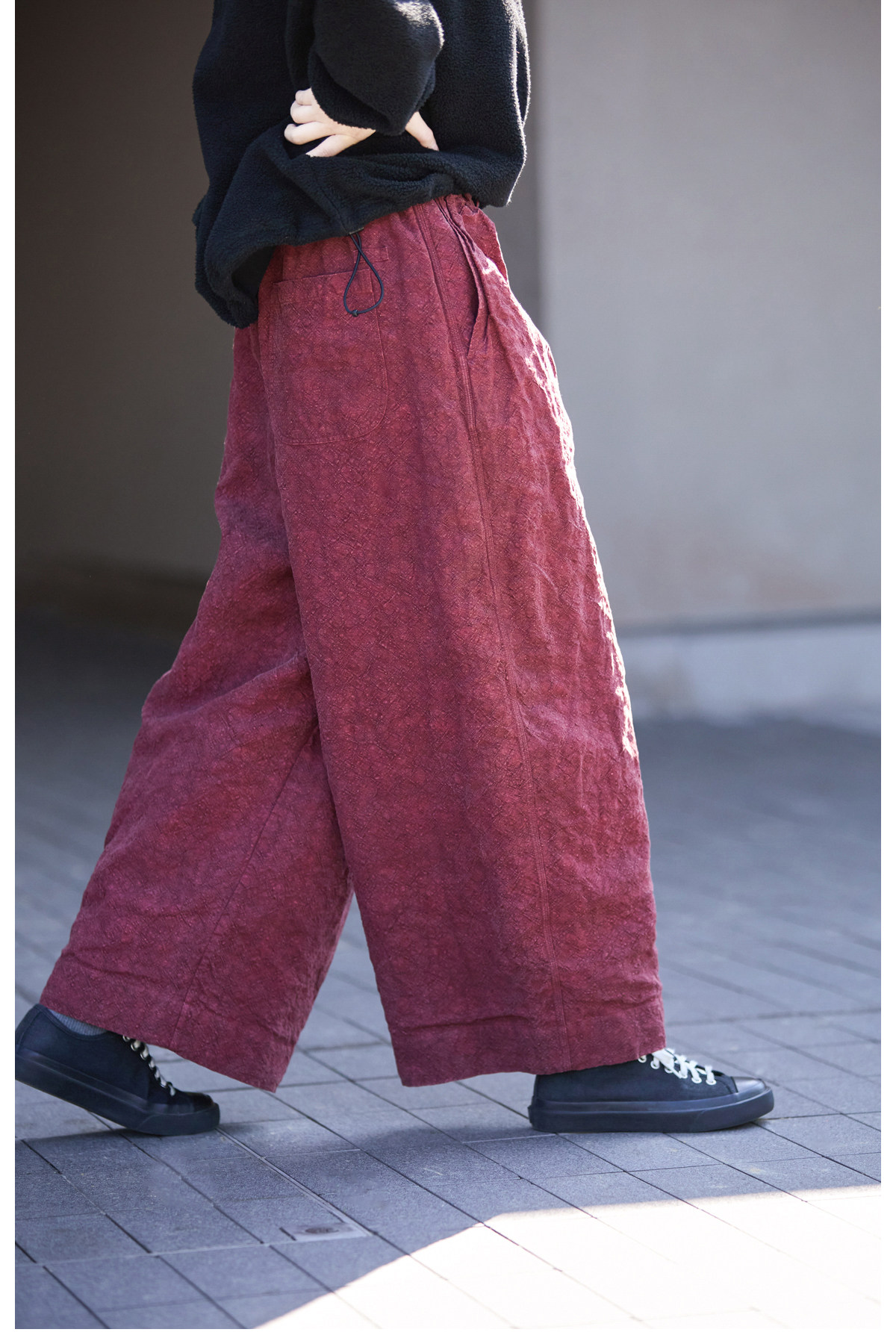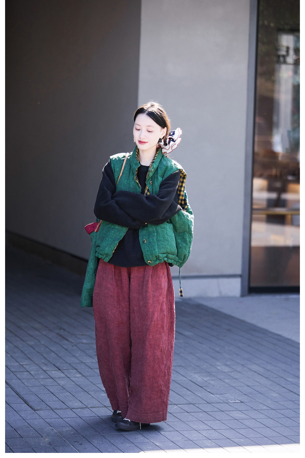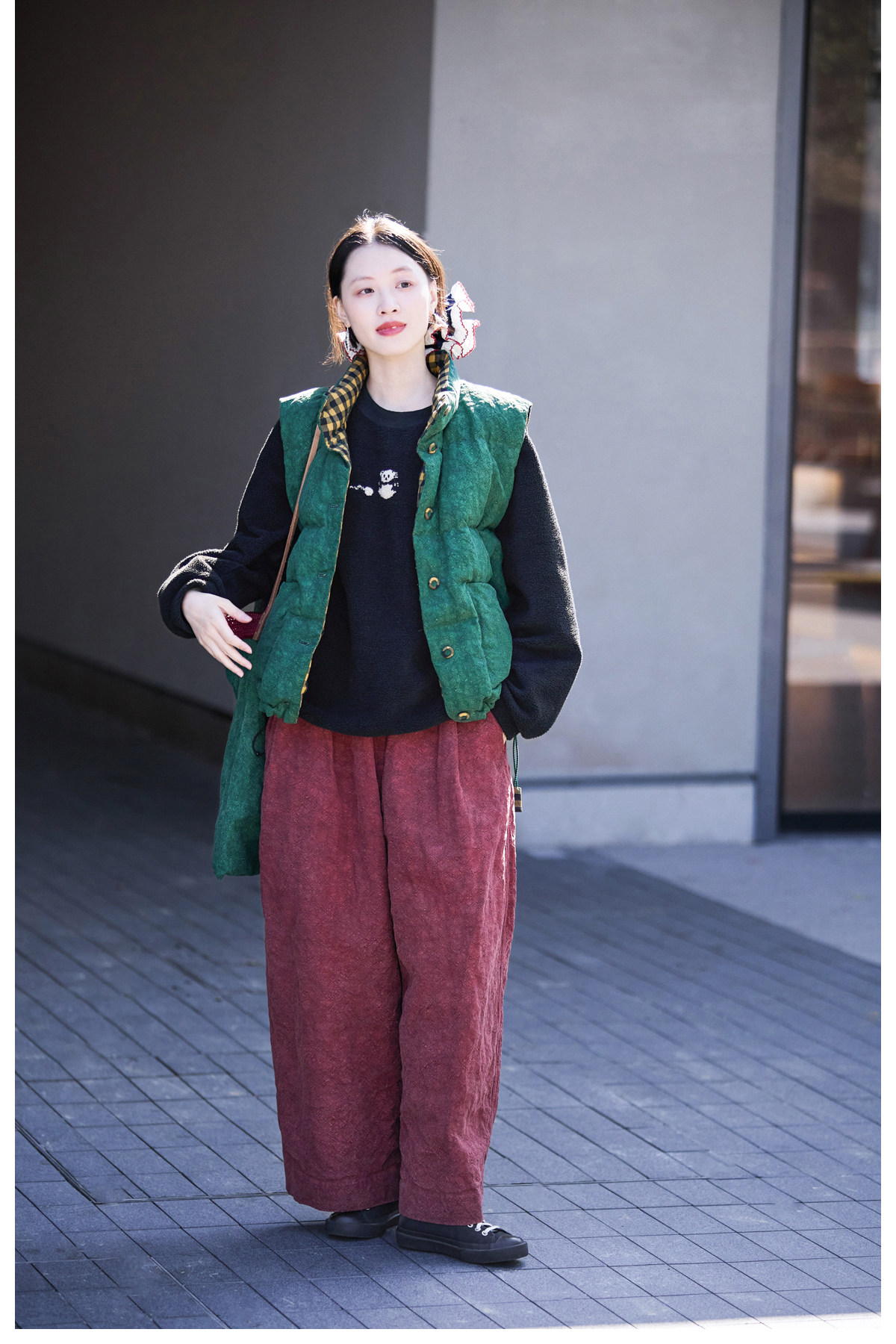 Original [Folk Art] Winter Style Burgundy High-Density Linen Warm Slimming Elastic Waist Cotton Pants 7330-4