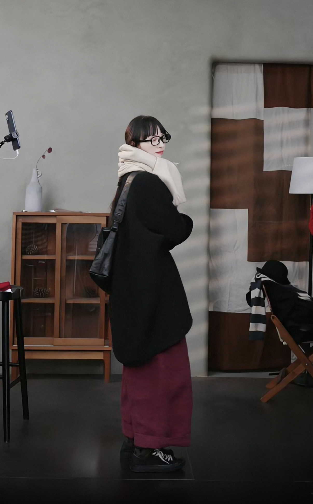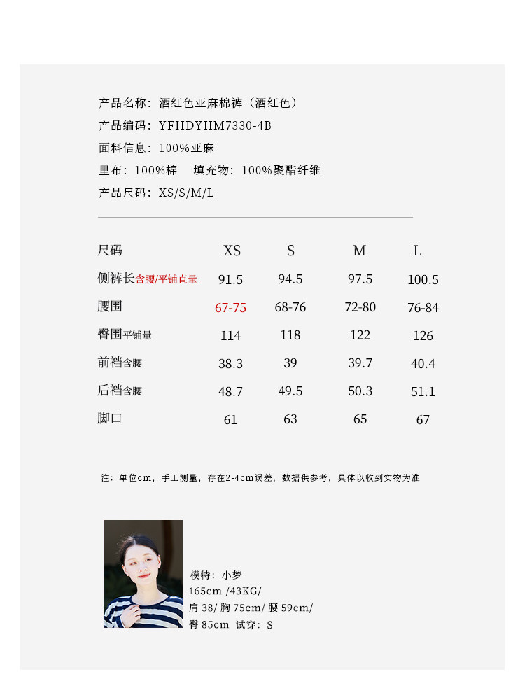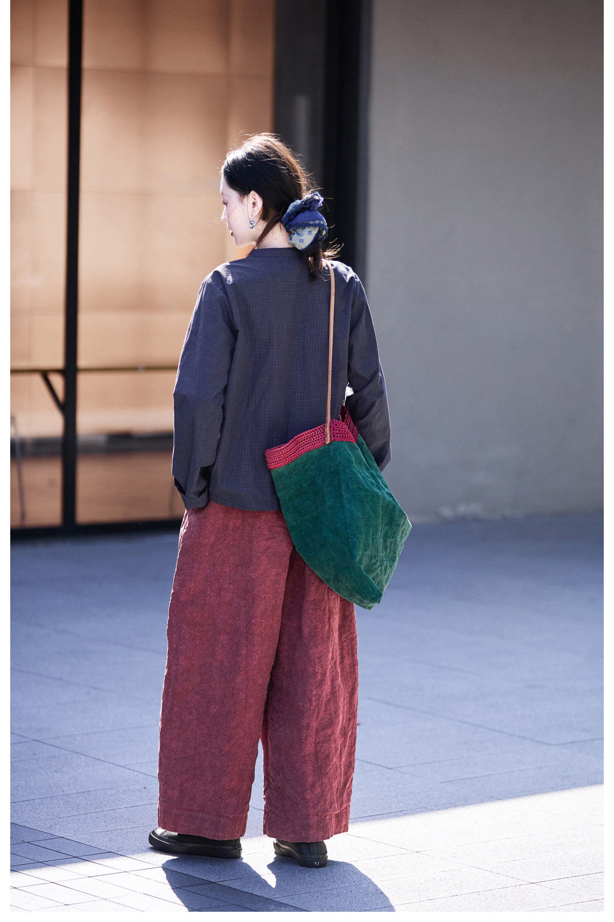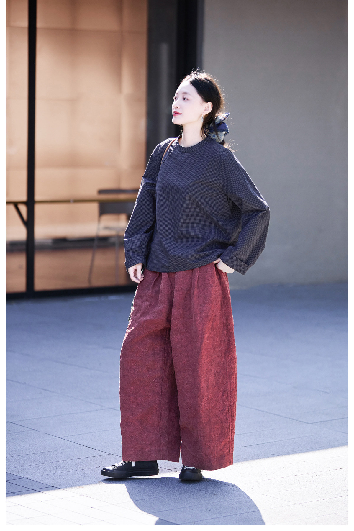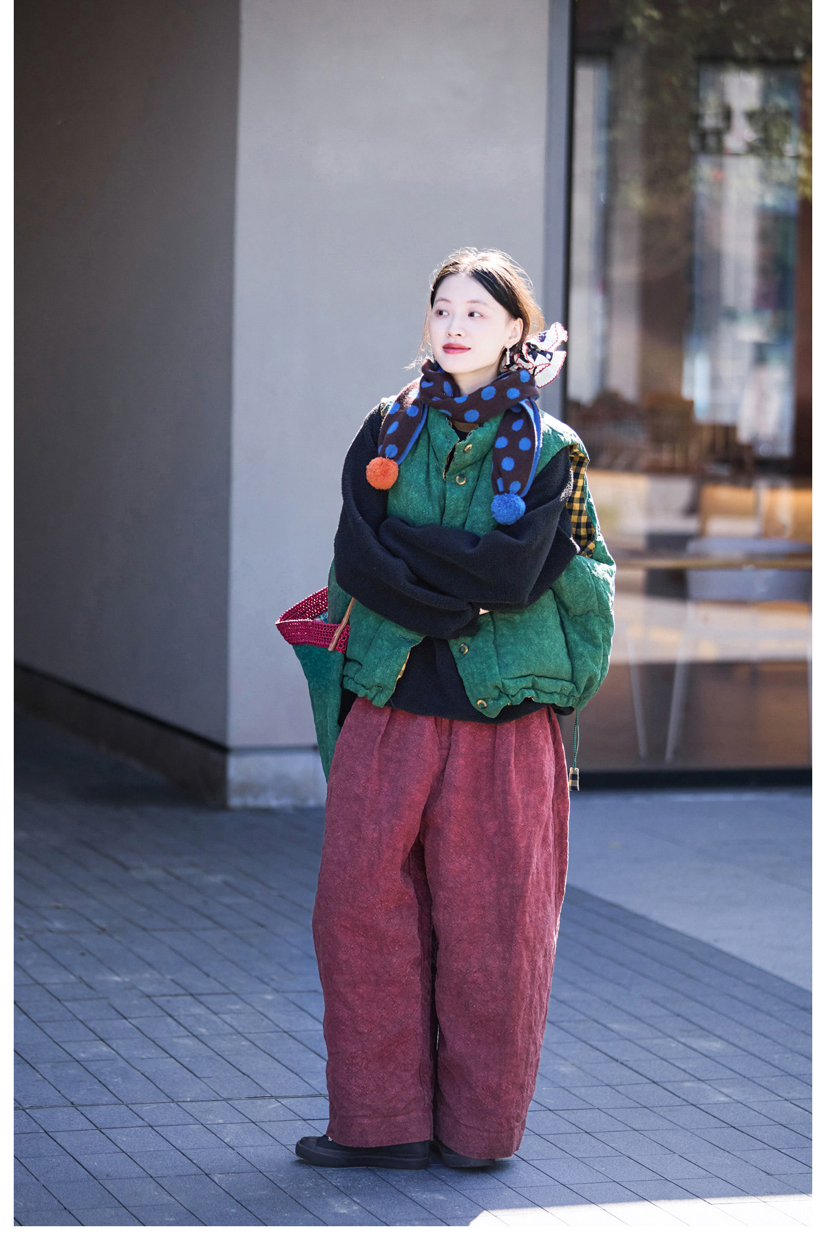 Original [Folk Art] Winter Style Burgundy High-Density Linen Warm Slimming Elastic Waist Cotton Pants 7330-4