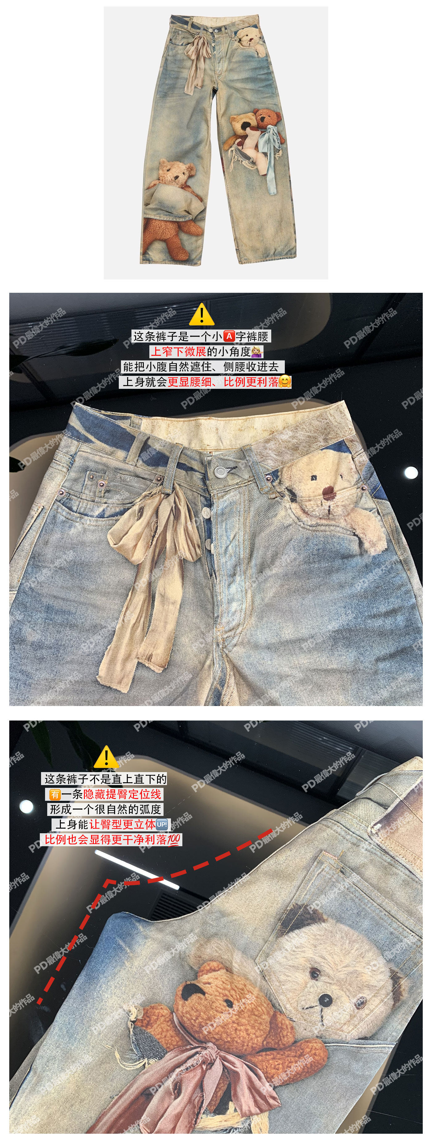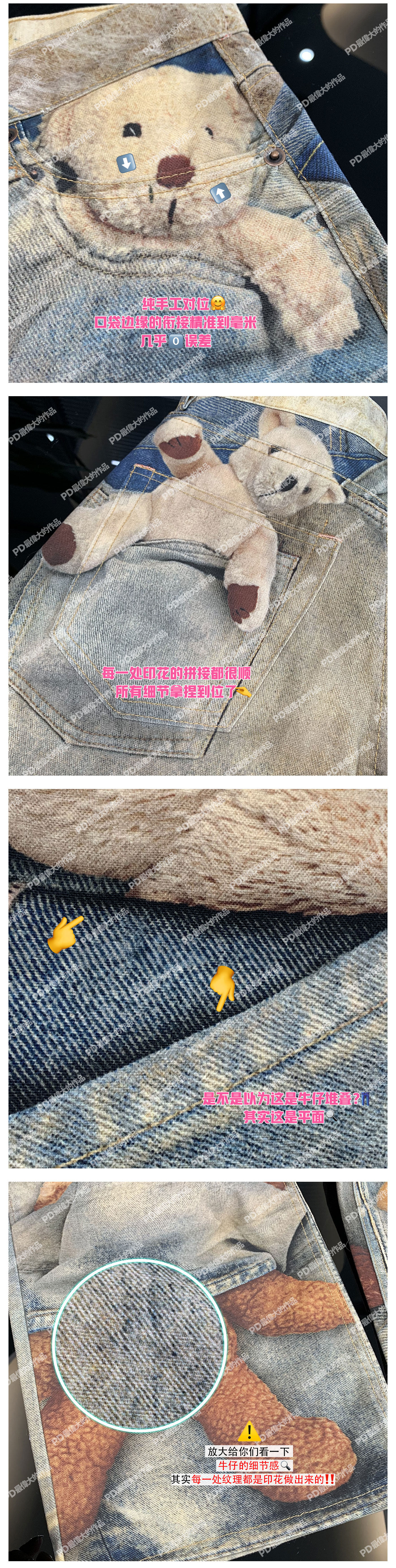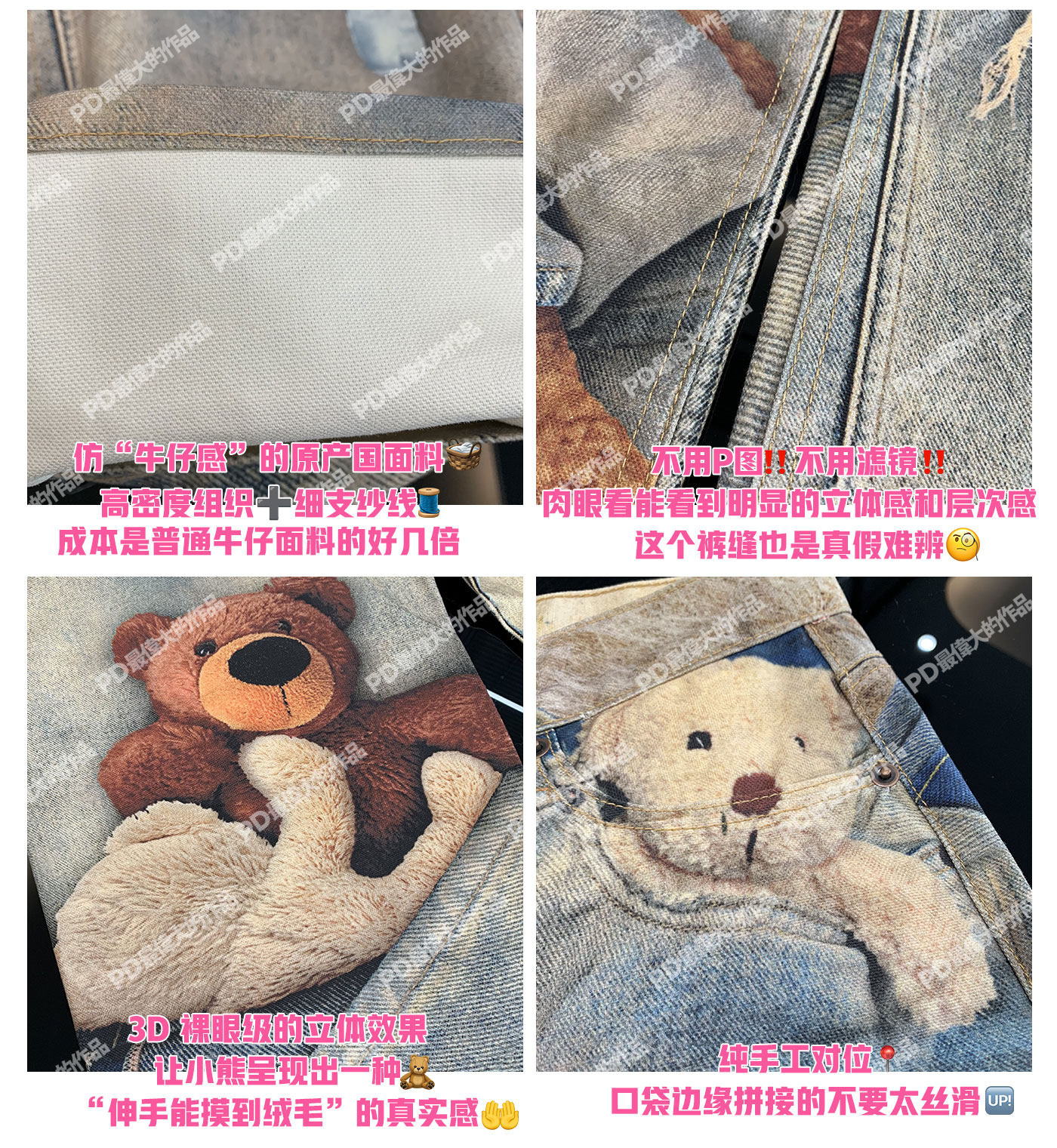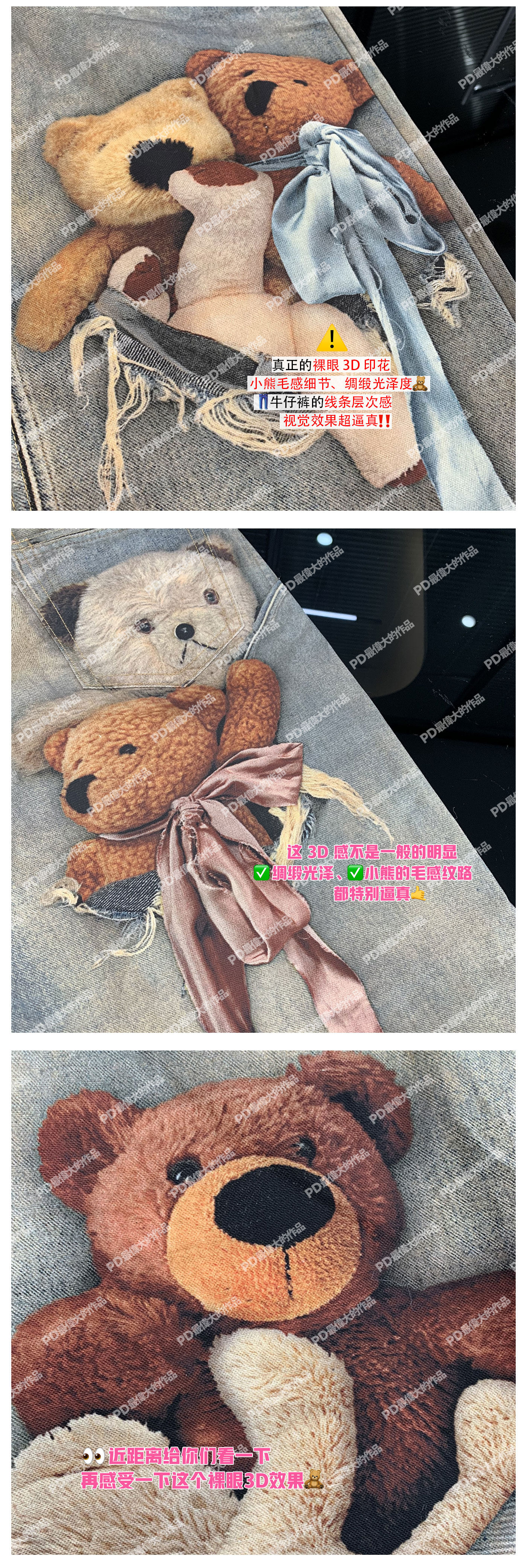 继蕾丝珍珠印花牛仔裤之后 又一个“王炸”来了 就是这条绸缎小熊玩偶印花牛仔裤 用的还是原产国面料 裤型依然是最经典的1981直筒 其实早在 11 月初 第一次刷到这个条裤子的时候 心里就很确定 这条裤子一定会火 所以当时PD团队没有任何犹豫 直接定项开发 现在看确实是对的 最近也有很多演员、爱豆、时尚博主 都已经上身这条小熊裤了