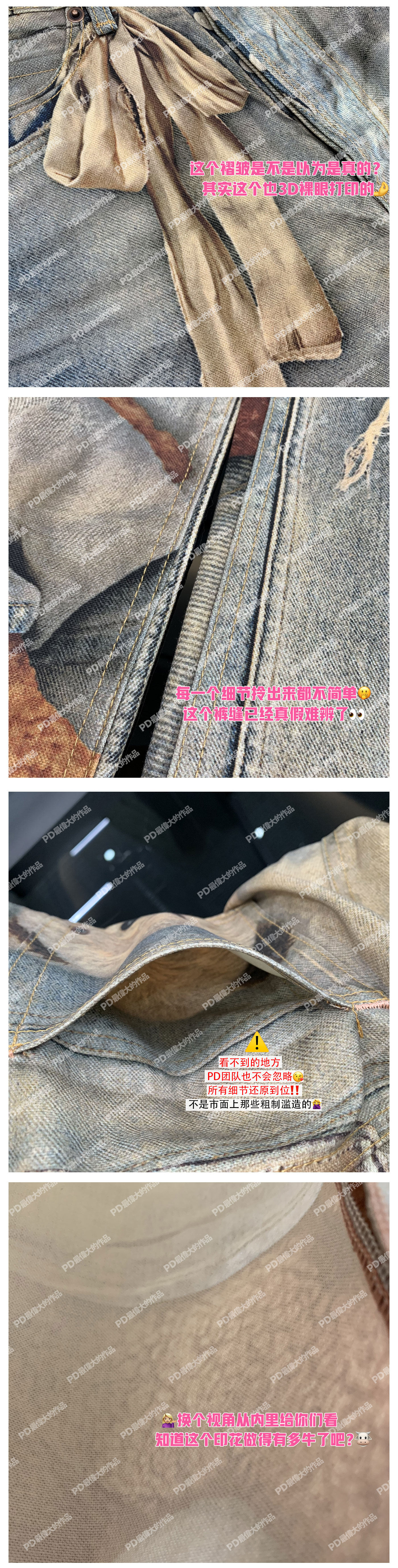 这个版型对 PD 来说 真的是轻轻松松、直接拿捏 毕竟之前那条全网爆火的蕾丝裤 经验就摆在那儿 依然是经典的 1981 直筒版型 它的精髓其实就在一个词“松弛感” 不贴 不紧 不鼓不炸 对腿型的包容度实在太高太高 这种松弛感不是靠放大余量堆出来的 而是靠精准的版型参数和比例 这一点PD团队都给你们把握到位了这条裤子有几十处拼接 但因为是整幅印花去做的 每一块拼接都被对位得非常干净 纹理、刷痕、缝线都做到了特别精准 拼接前后要过轮校验 最大误差没有超过1.5mm 3D裸眼打印 一台设备400w+ 印花机天花板 用的是日本原装进口工业印花机 色牢度清晰度过渡感耐洗表现 顶格拉满 郑重声明 本团队只做超一线研发 不碰任何市场混卖批发版本