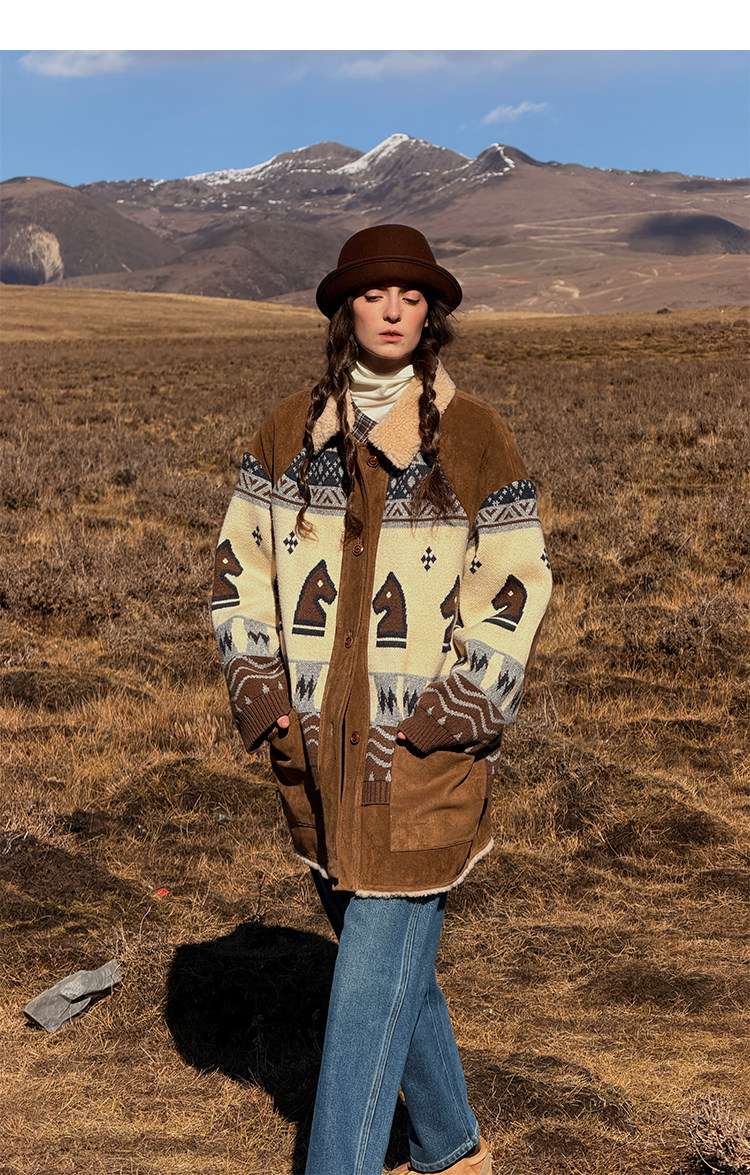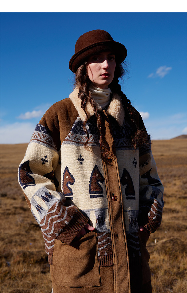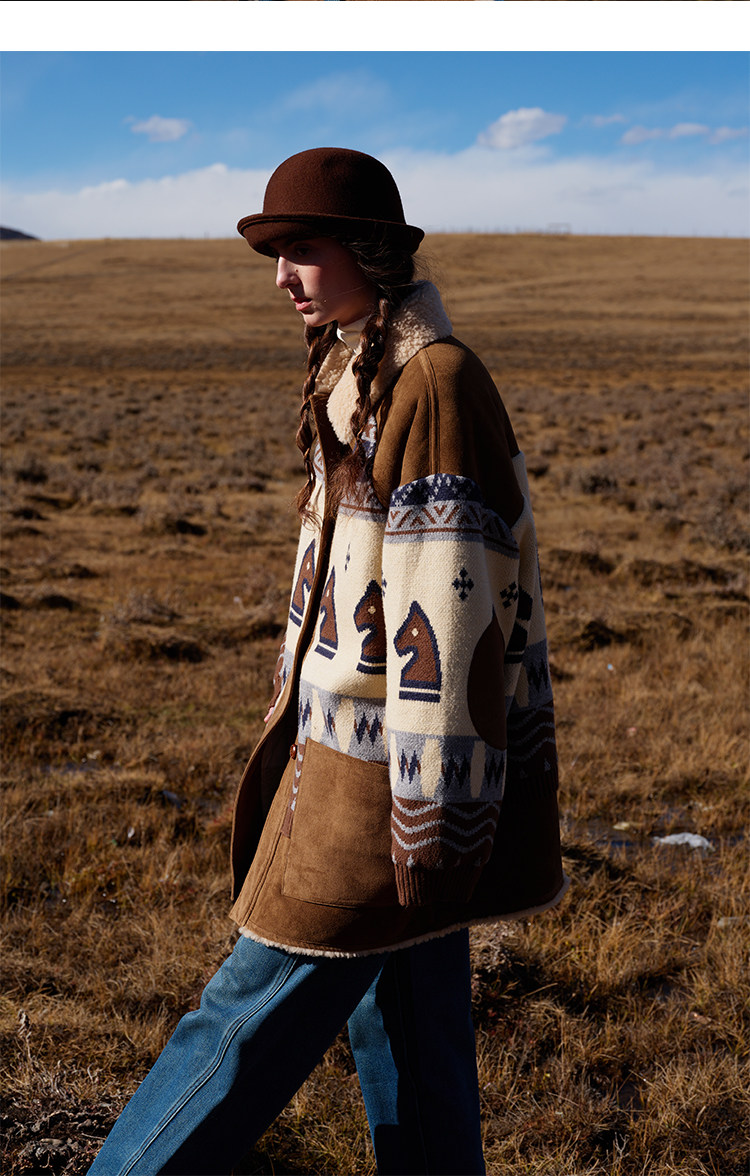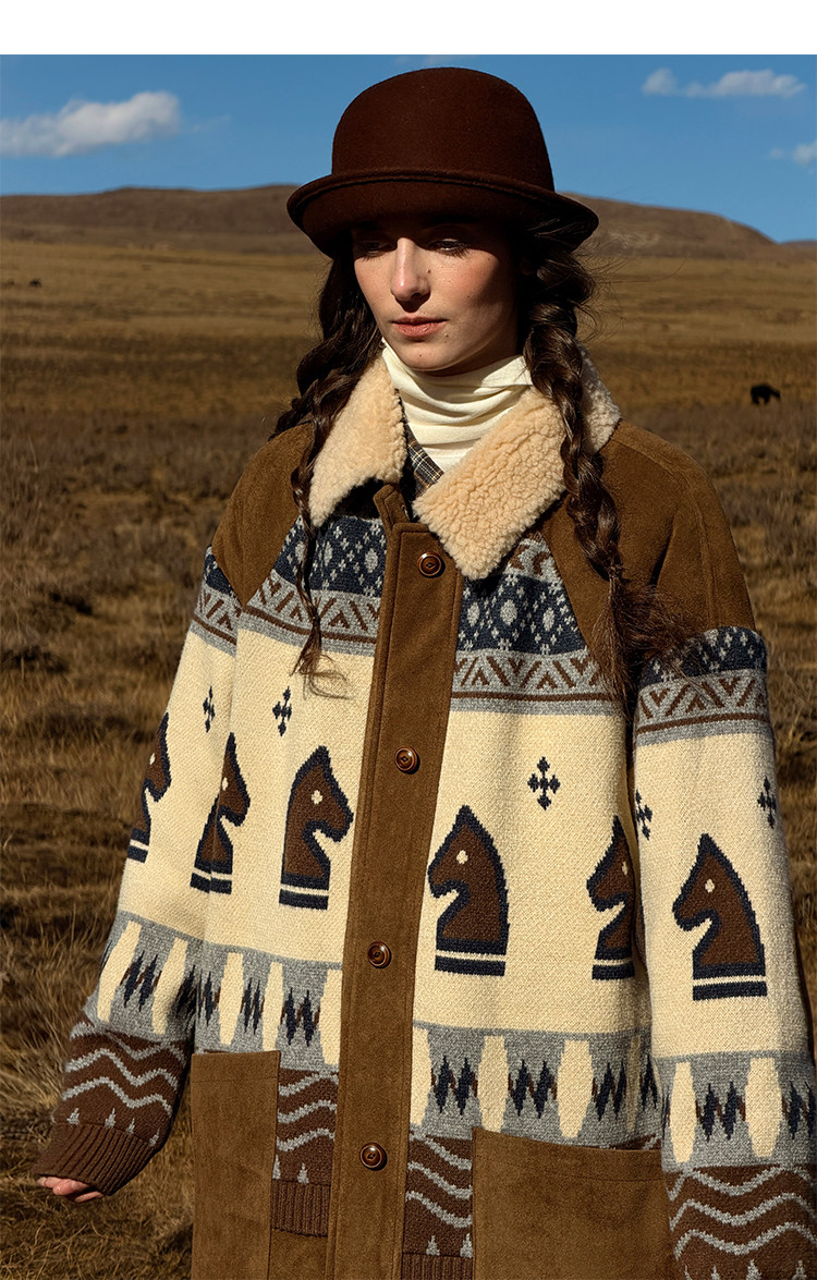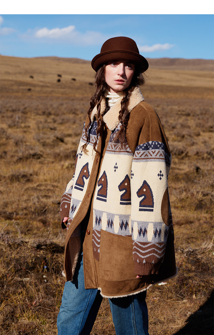 Itoshiroshi Lapel Wool and Fur Integrated Patchwork Horse Head Pattern Knitted 3m Thinsulate Padded Jacket