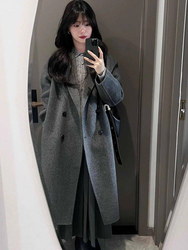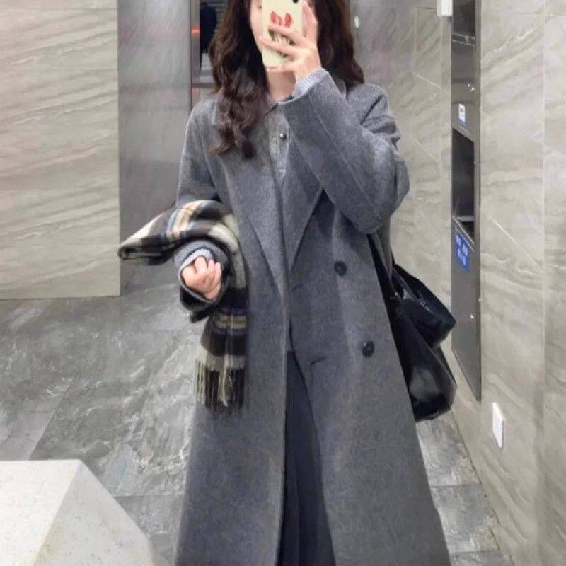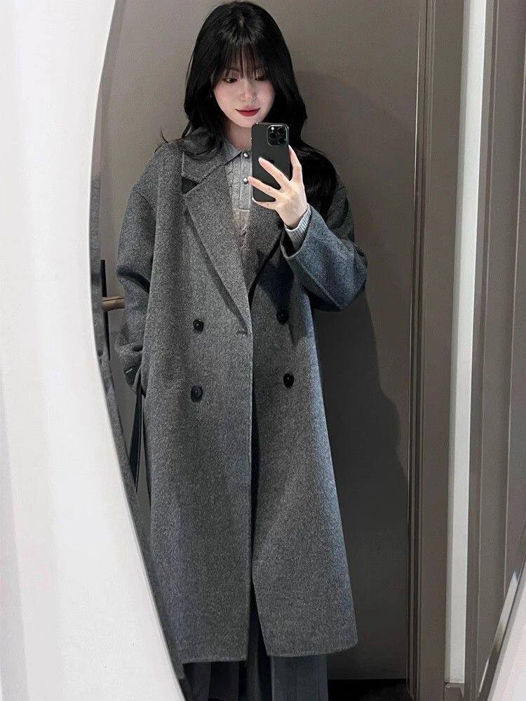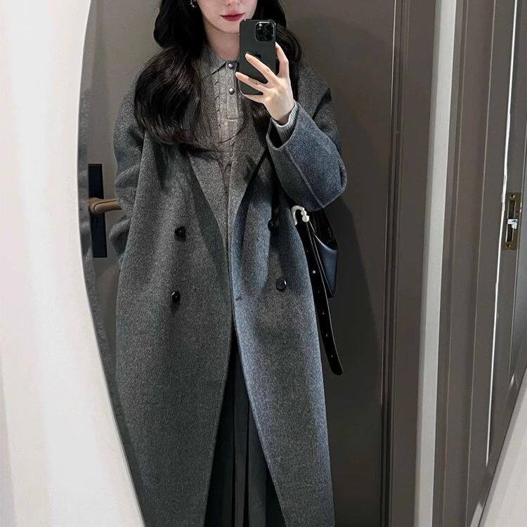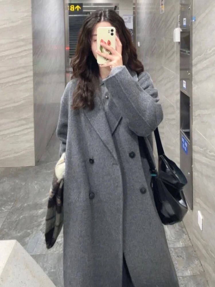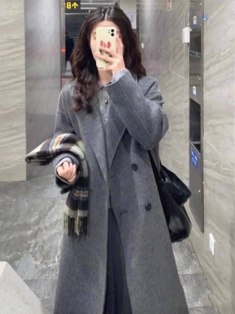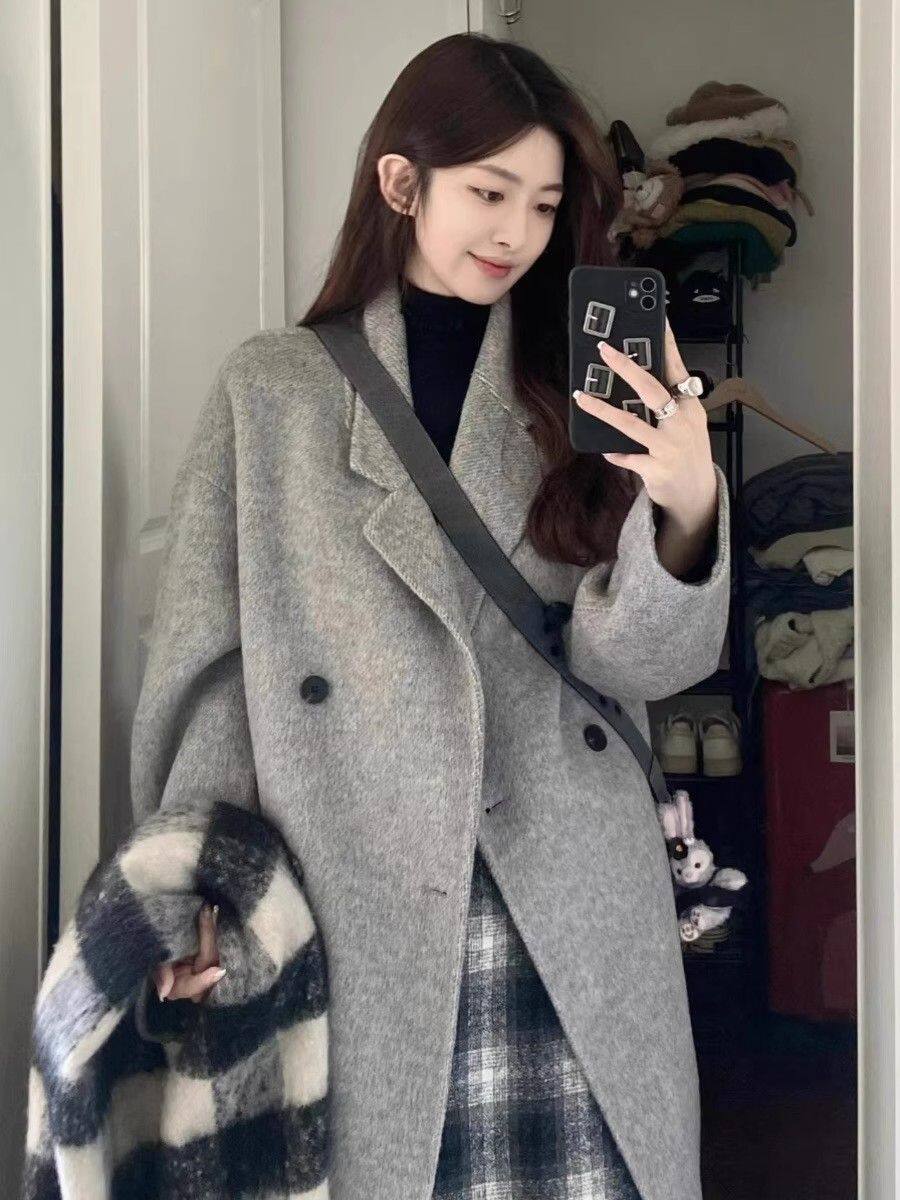 Korean-Style Hepburn-Inspired Gray British Retro Coat for Women, Mid-Length Double-Breasted High-End Old Money Style Jacket