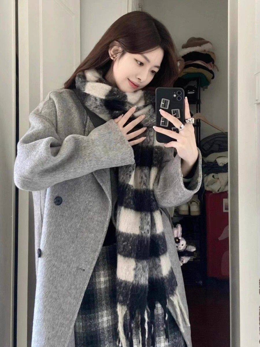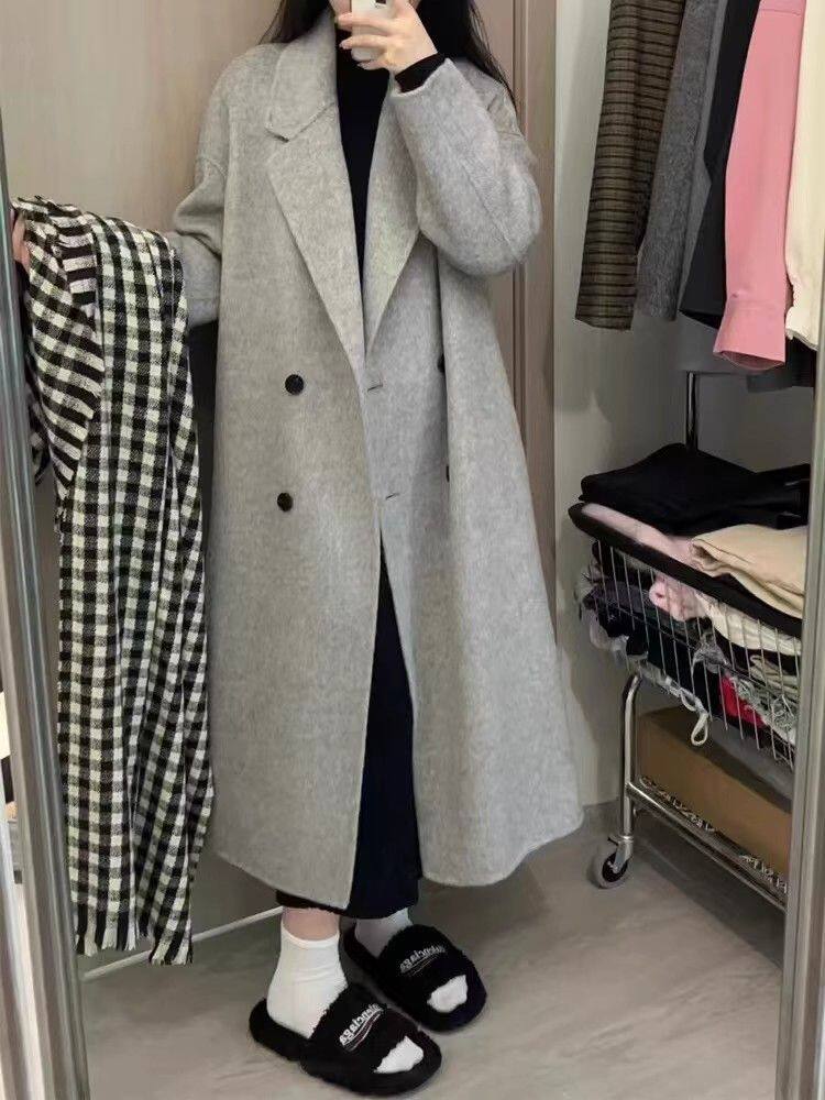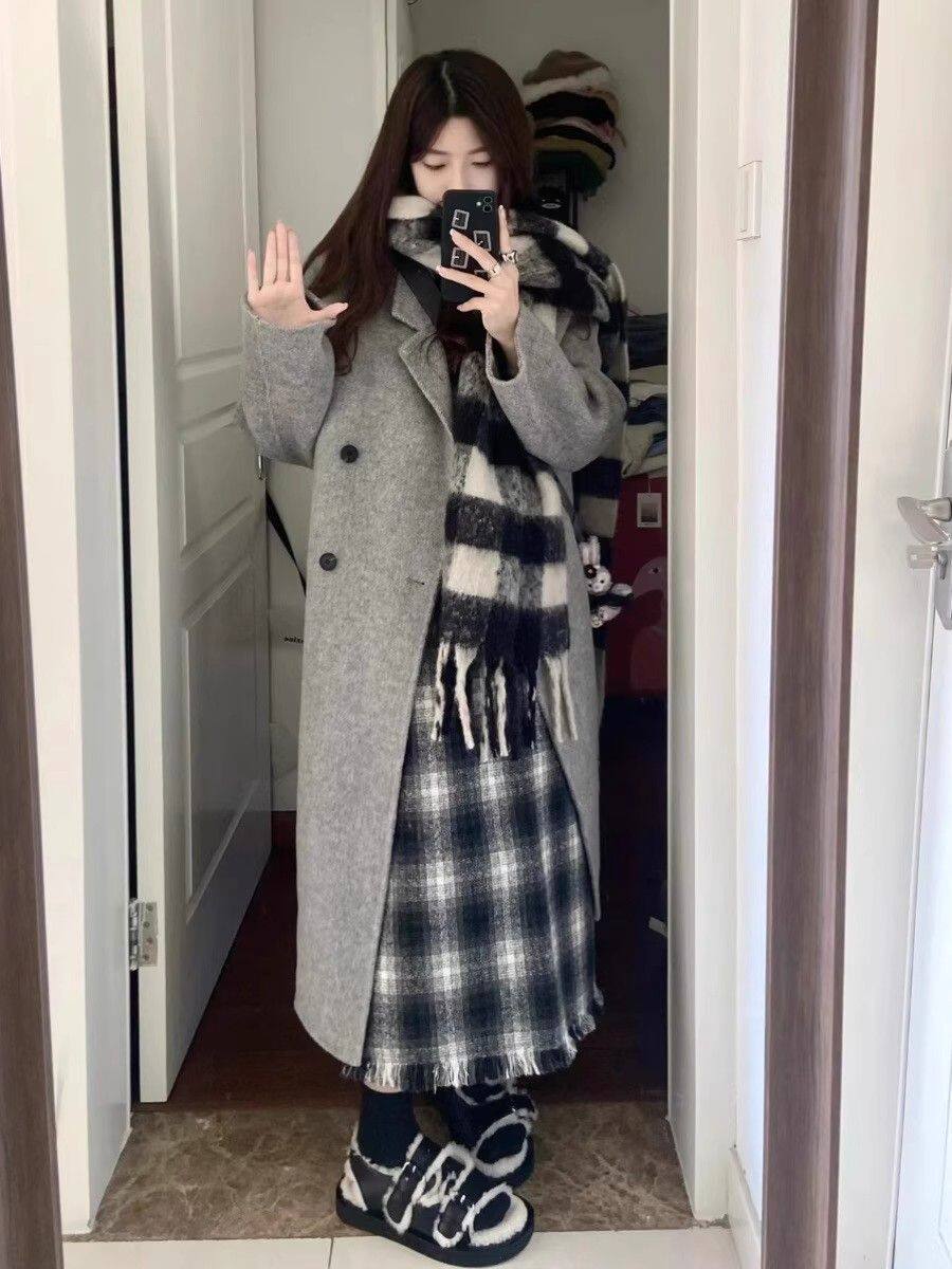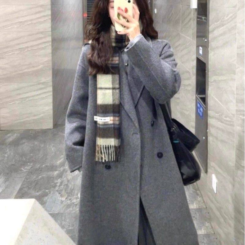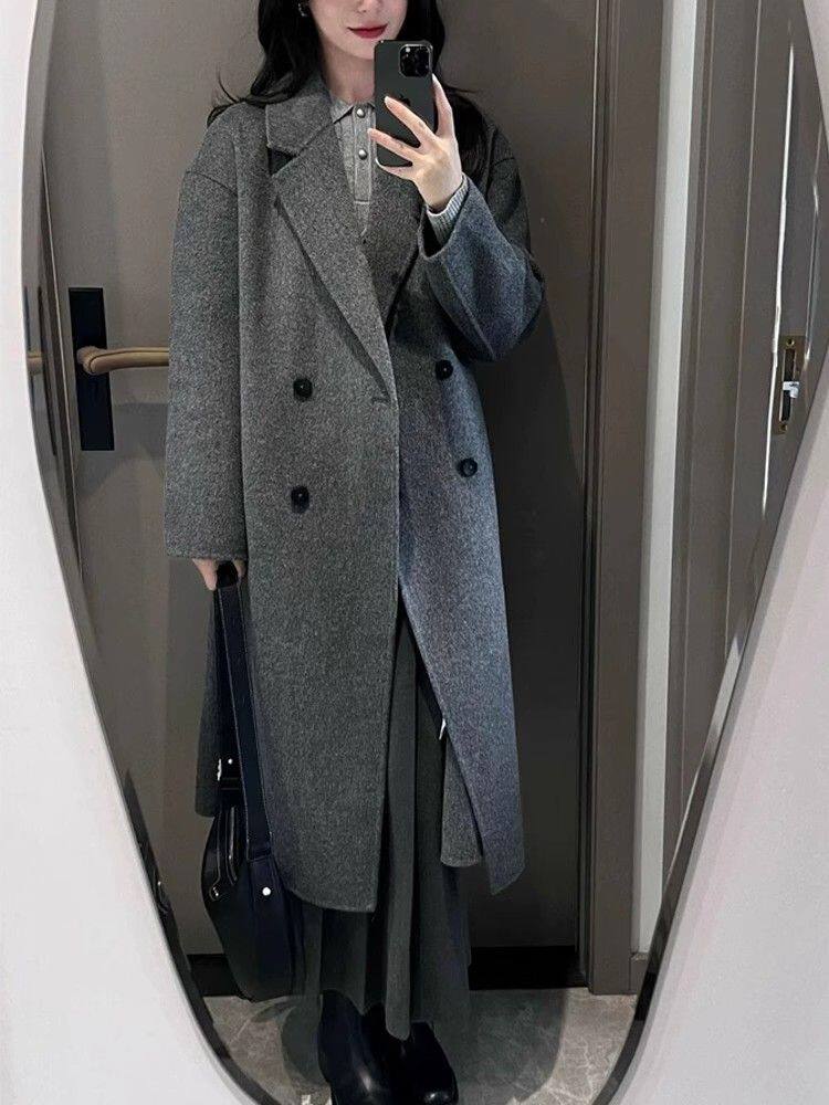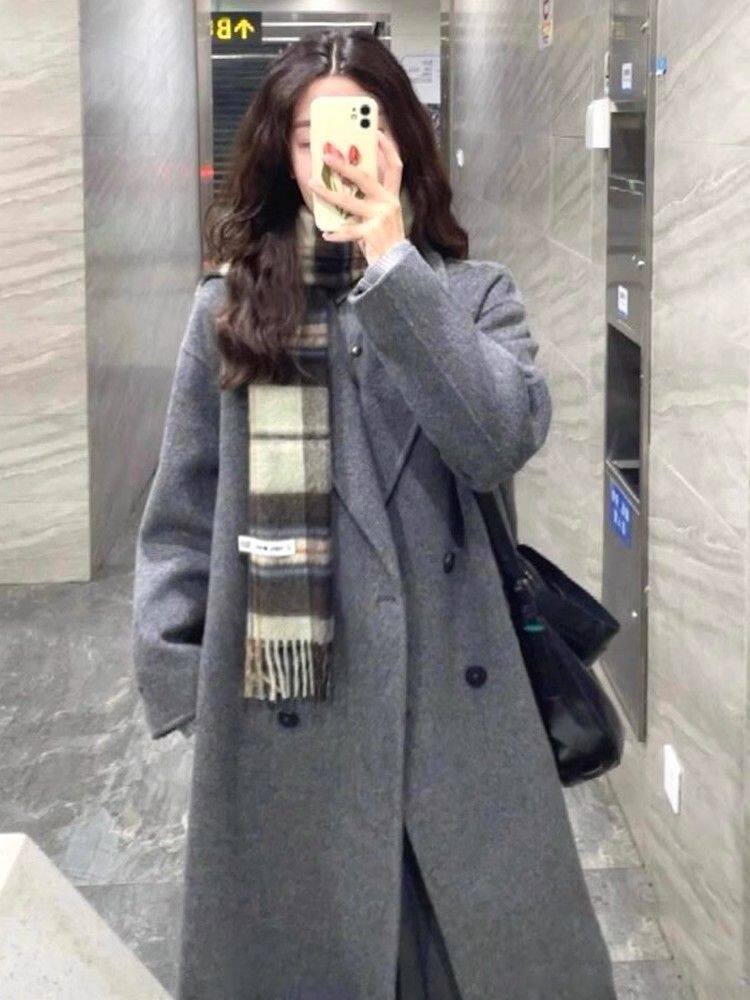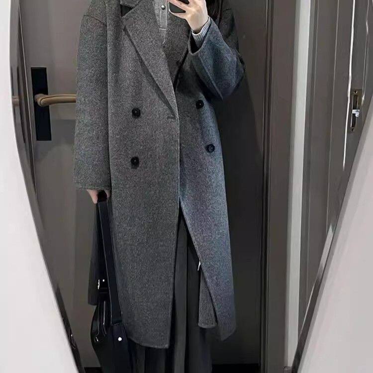 Korean-Style Hepburn-Inspired Gray British Retro Coat for Women, Mid-Length Double-Breasted High-End Old Money Style Jacket