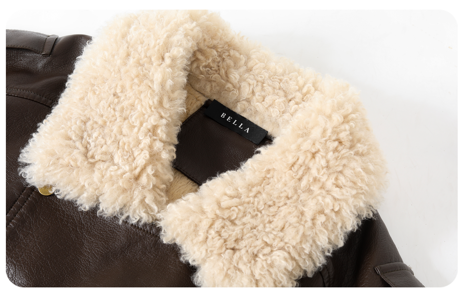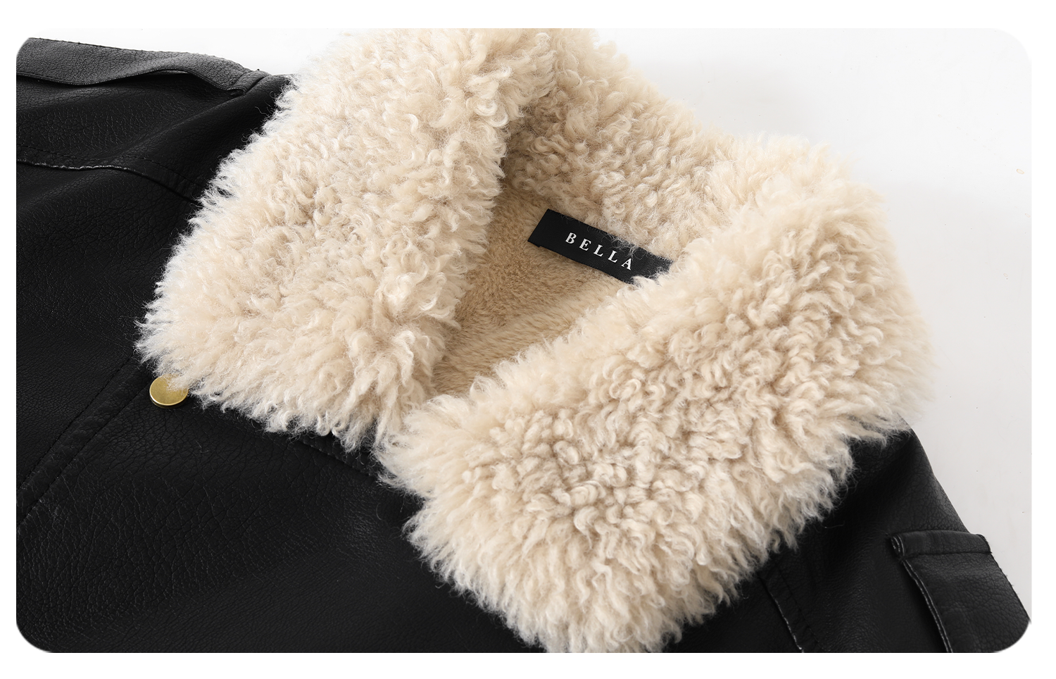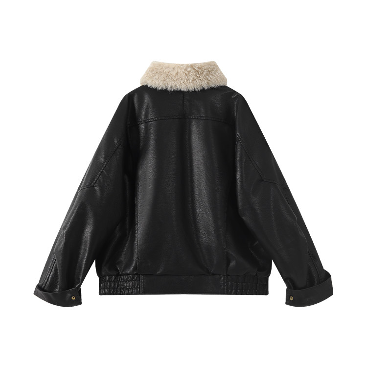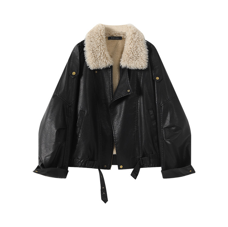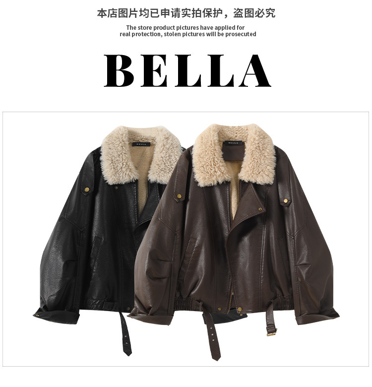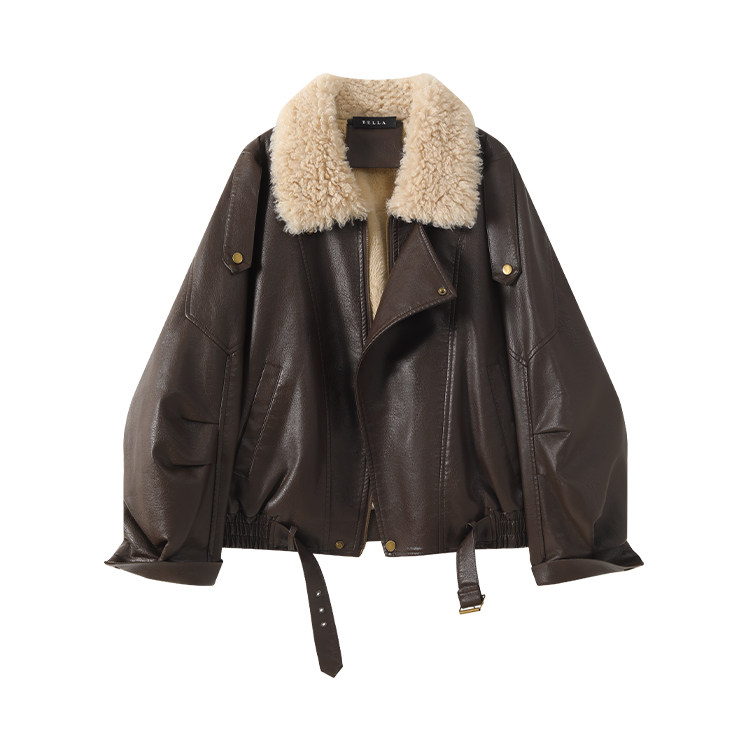 Bella Melard Lamb Wool Lapel Leather Jacket for Women, Winter Retro Fleece-Lined Thickened Pu Leather Biker Jacket