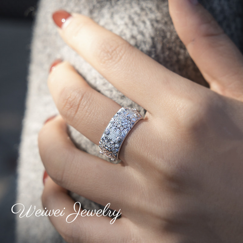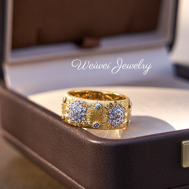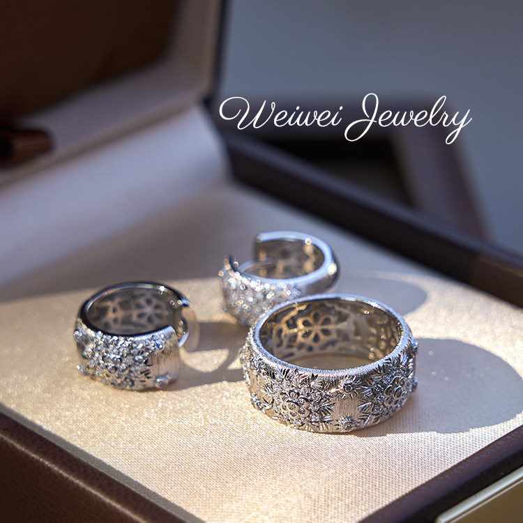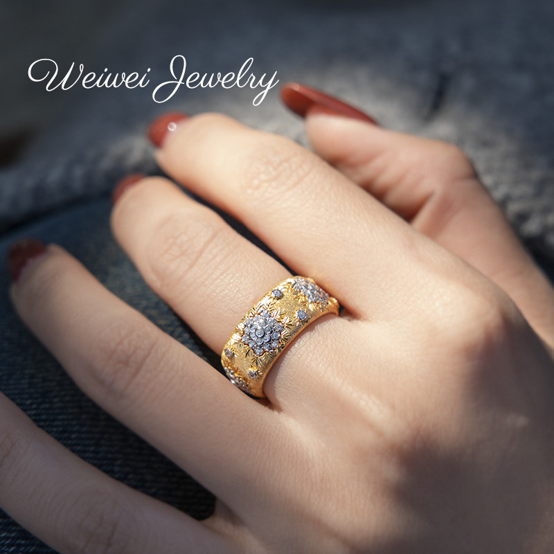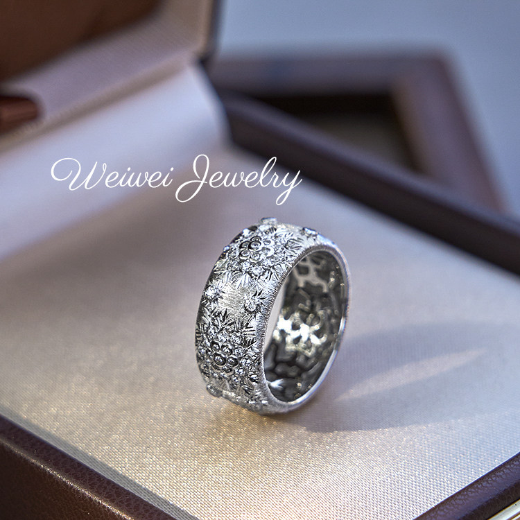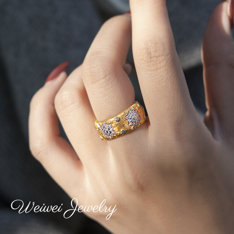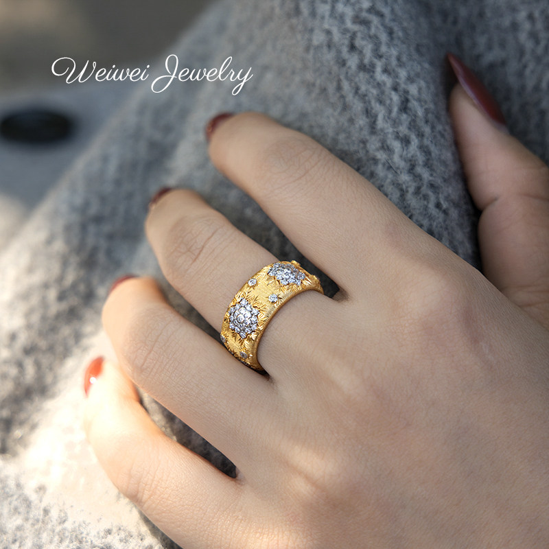 Niche Vintage Italian Brushed 925 Silver Gold-Plated Hollow Lace Vine Flower Inlaid Diamond Ring