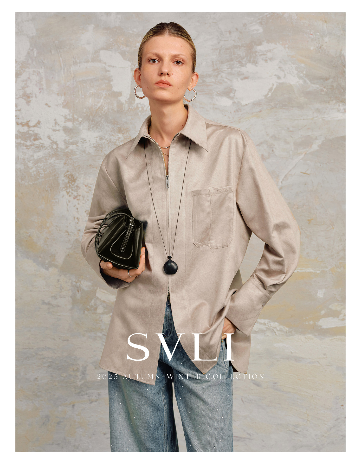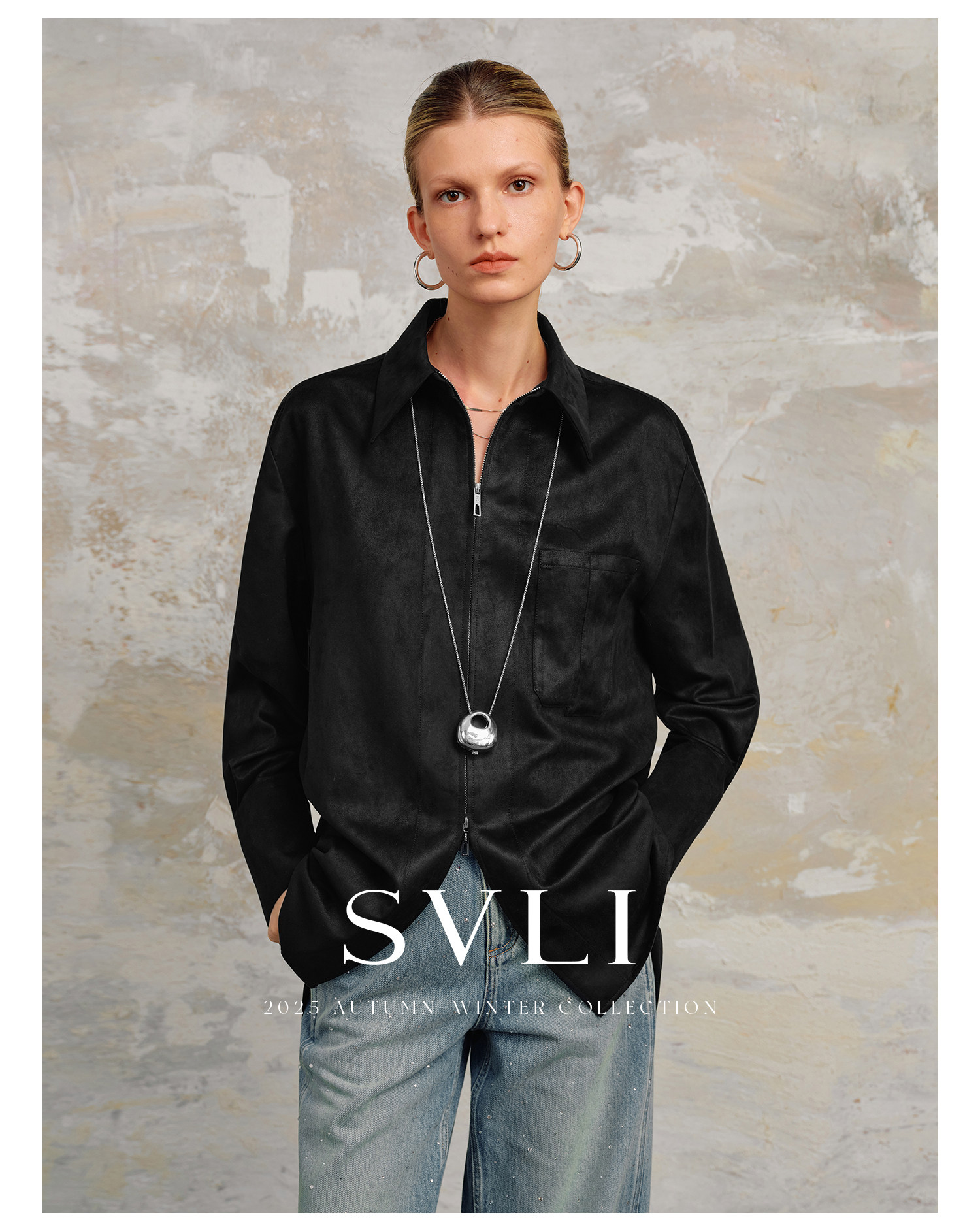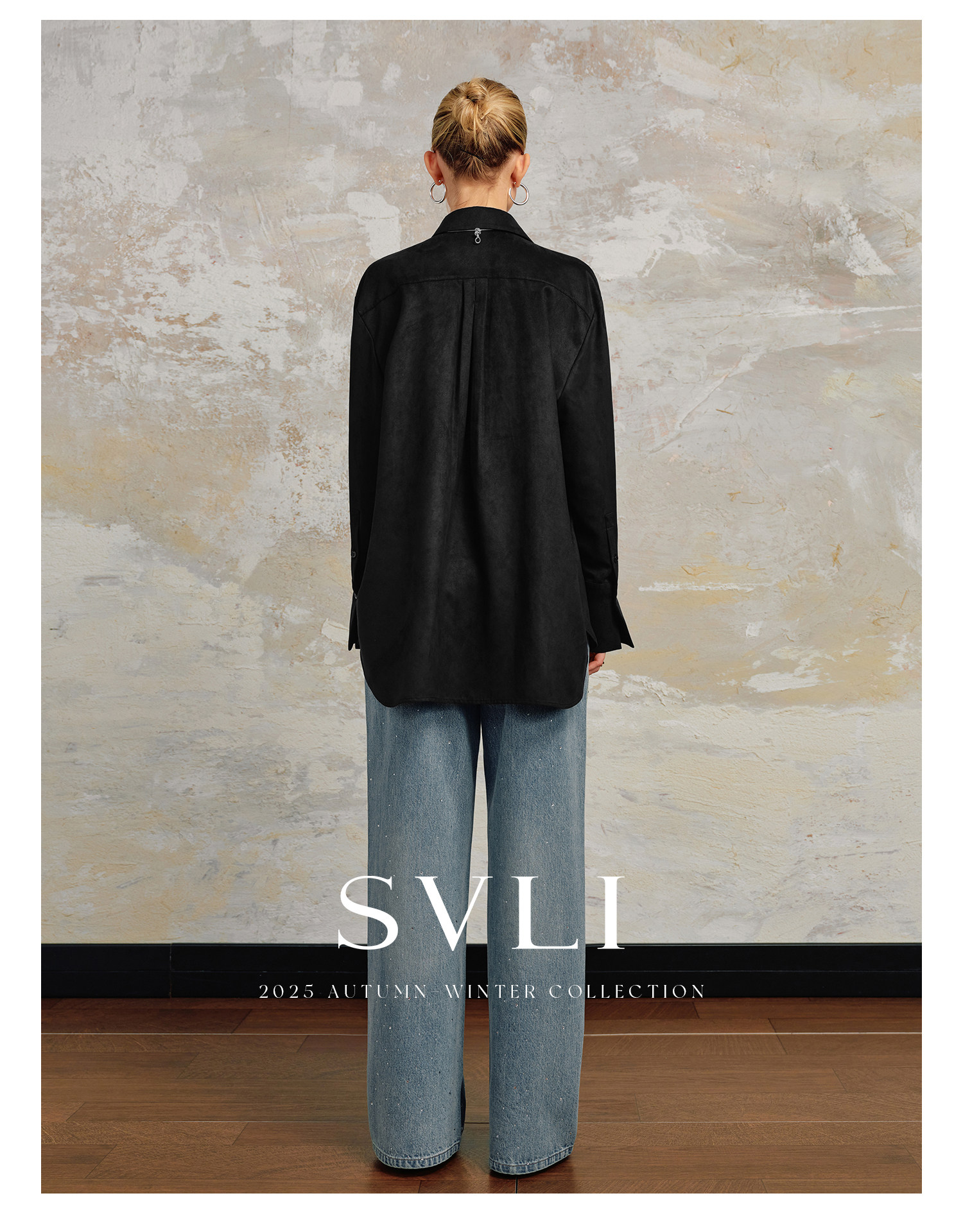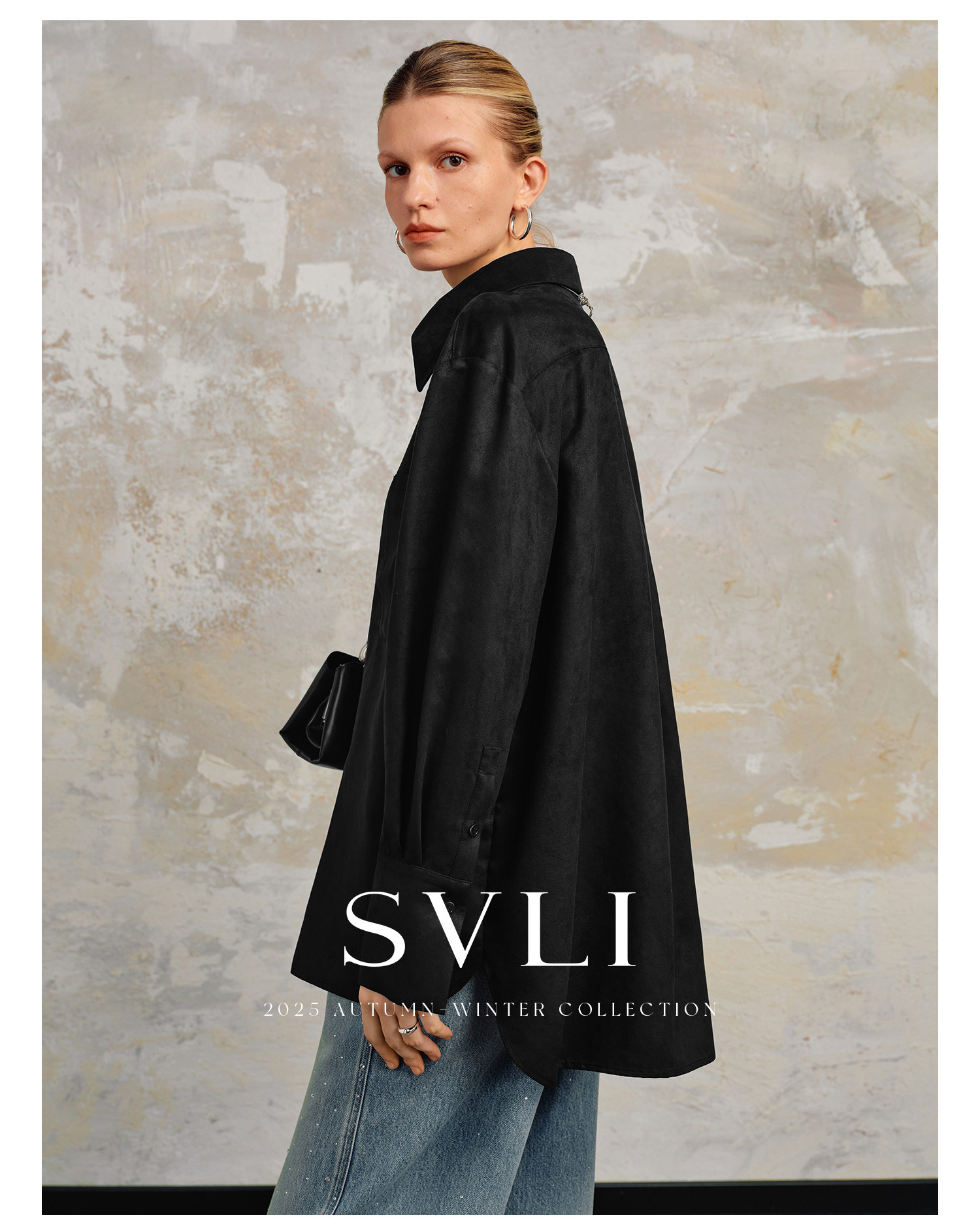 Svli|'Two-Way Journey' Series Soft Suede-Like Embroidered Two-Way Zipper Oversized Shirt Jacket