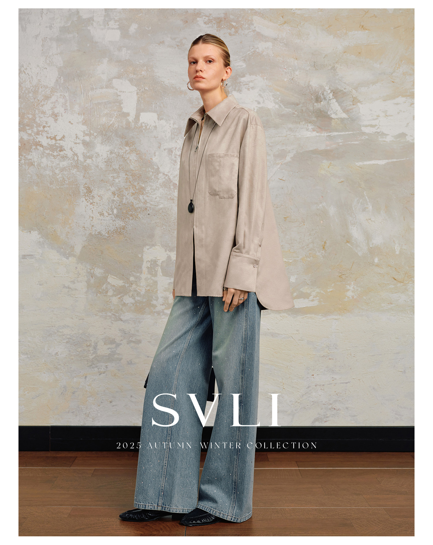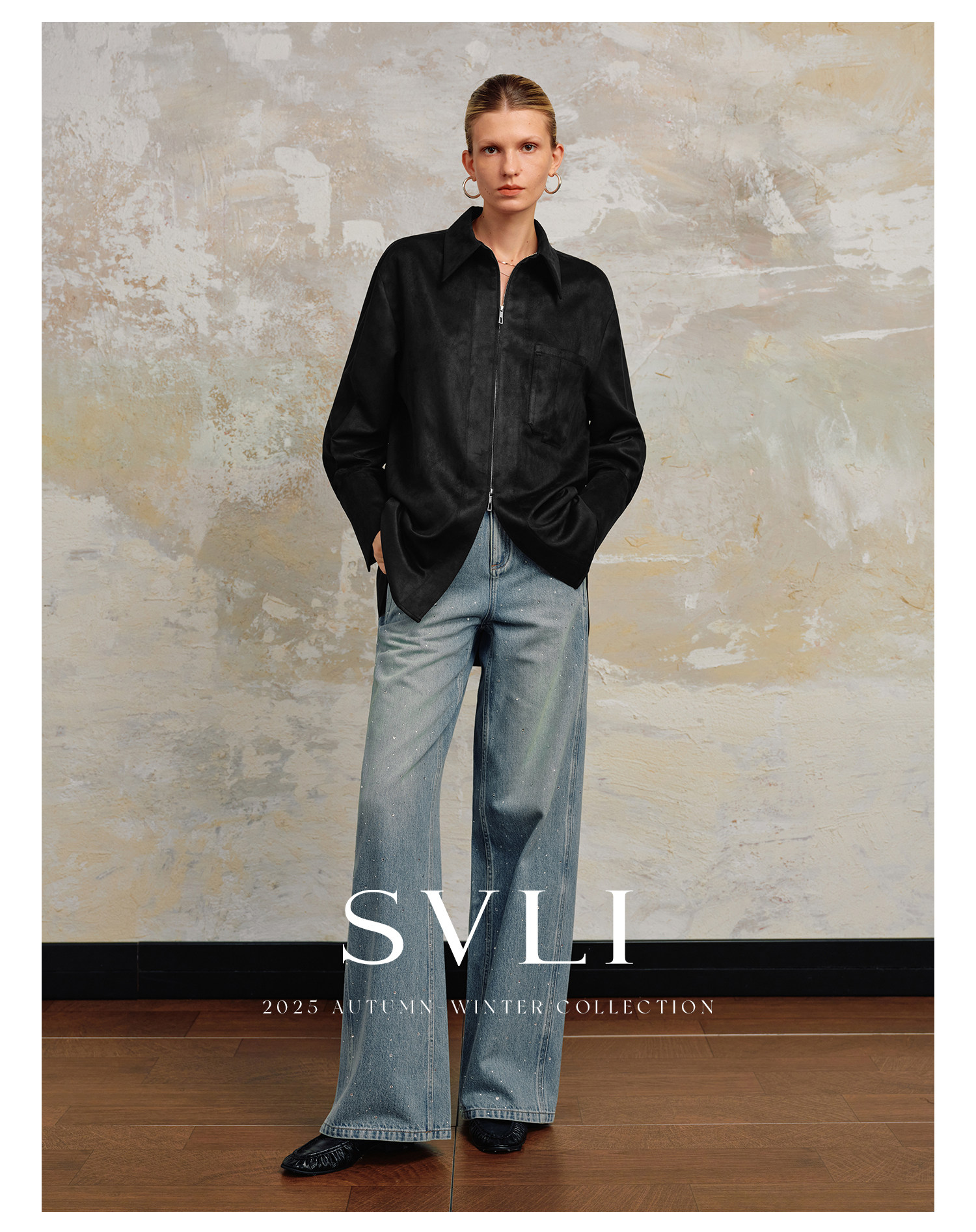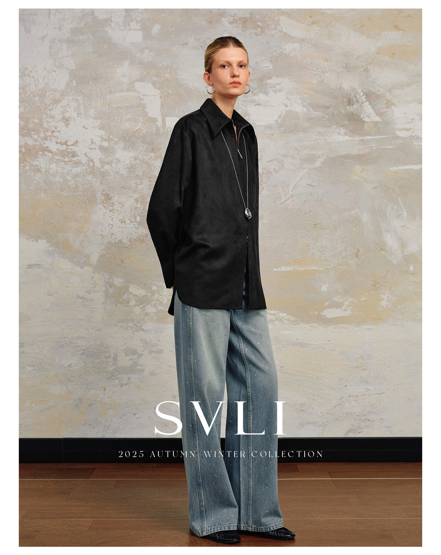 Svli|'Two-Way Journey' Series Soft Suede-Like Embroidered Two-Way Zipper Oversized Shirt Jacket