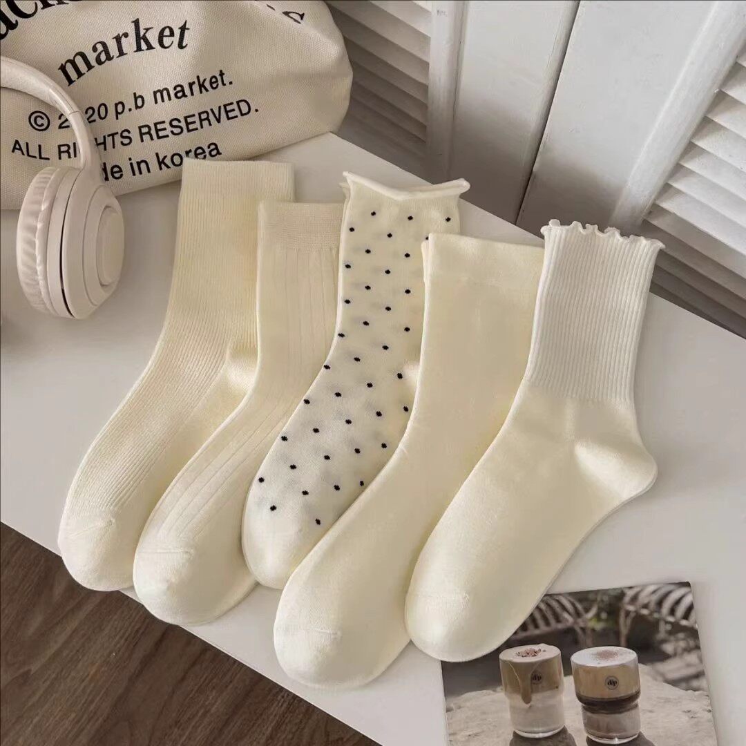 Milky white mid-leg socks spring and autumn versatile solid color stacked socks stockings Korean version polka dot fungus edge confinement socks girl
