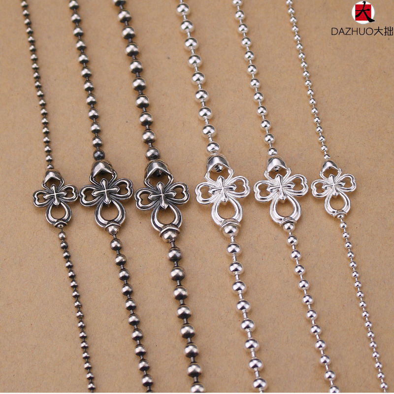 Big clumsy cross plum blossom buckle bead necklace S925 sterling silver plain chain vintage men's and women's collarbone chain long chain pendant with chain