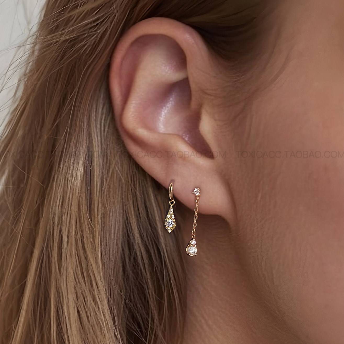 "Morning Dew" TOXIC designer gold diamond-encrusted water drop 925 silver mini delicate chain pendant stud earrings