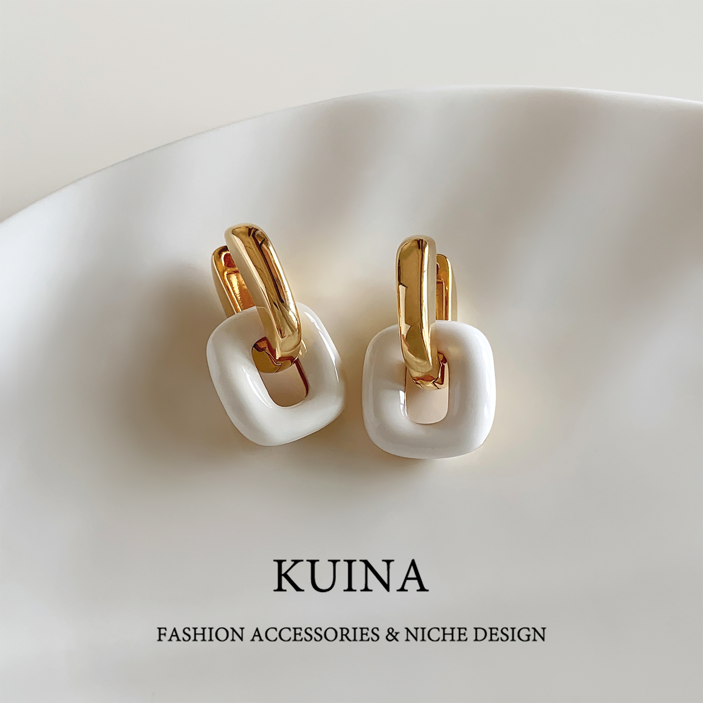 Niche high-end white enamel earrings women's French light luxury temperament stud earrings square gold earrings