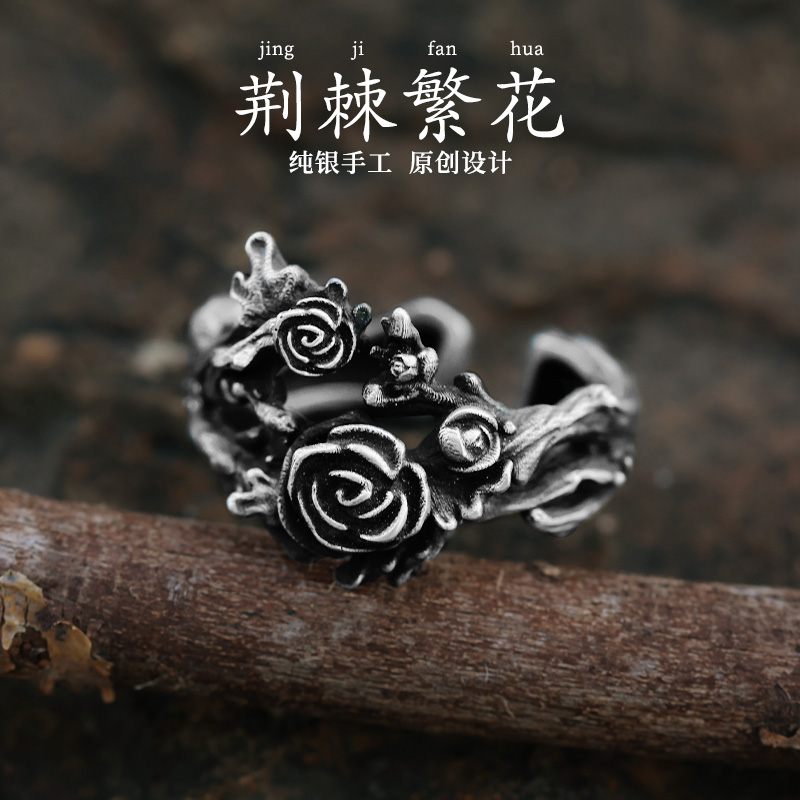 Silver original "Thorn Flower" 999 sterling silver handmade ring foot silver men's single boy vintage single ring