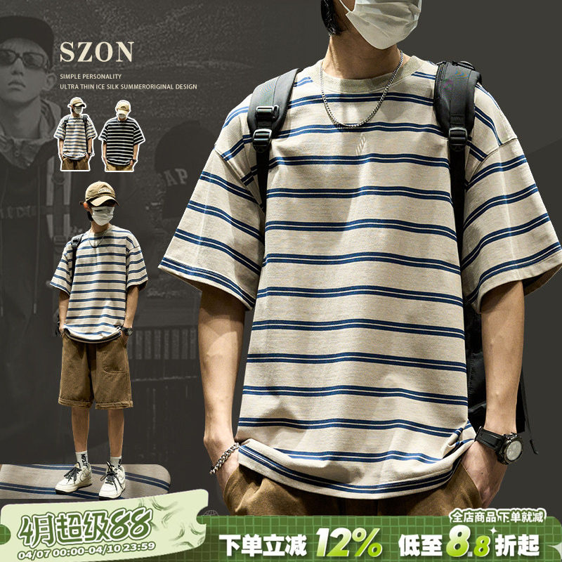 Striped T-shirt Men's 2026 New American Trendy Brand Pure Cotton Crew Neck Half Sleeve Loose Casual Hong Kong Style Short Sleeve ins Summer