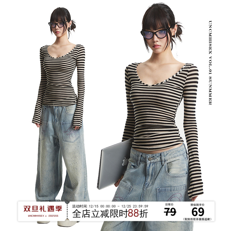 UNCMHISEX Vintage Striped Long Sleeve T-Shirt Base Jacket Women's New Slim Hot Girl Design Inner Top