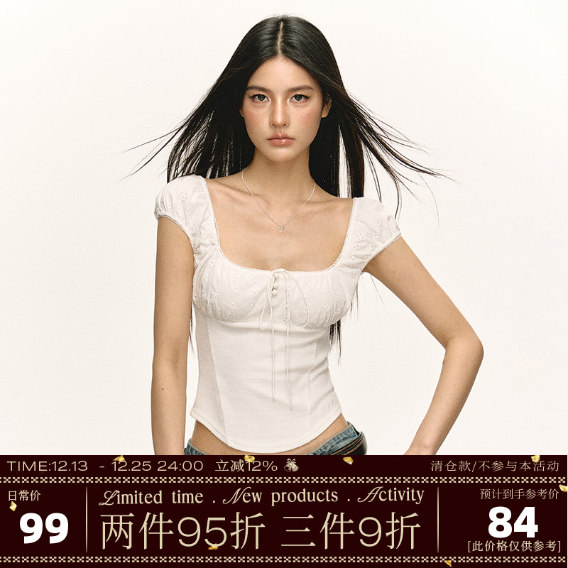 Ariseism American Spice Girl slim design square neck short sleeve T-shirt women's summer cropped puff sleeve top