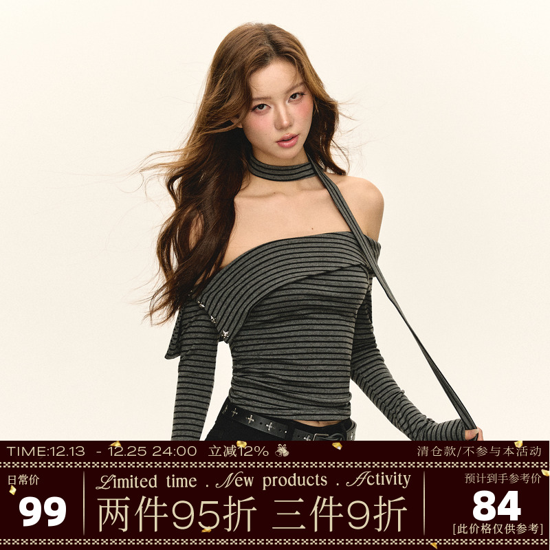 Ariseism American Spice Girl Design Striped One-Shoulder Long Sleeve T-Shirt Women's Fall Slim Off-the-Shoulder Top