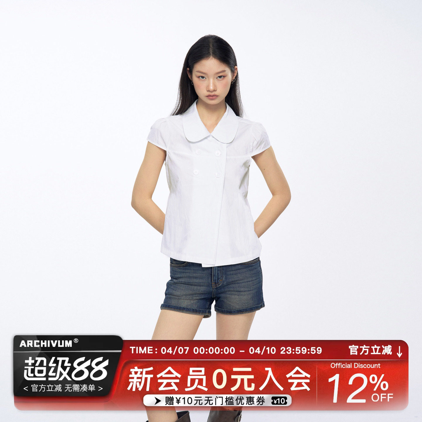 Archivum Summer Vintage Double Row Seashell Buckle Shoulder Doll Collar Shirt Cinched Waist Cut Design Short Sleeves