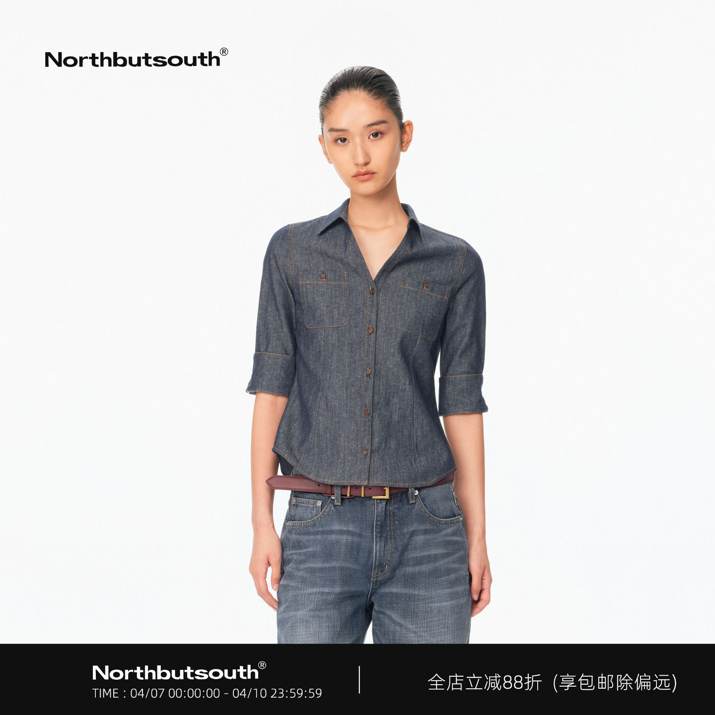 Northbutsouth V-neck original cow texture waist folded casual mid-sleeve shirt