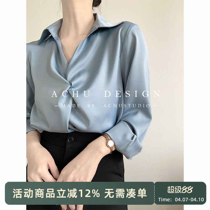 ACHU at first sight blue V-neck satin shirt women's professional shirt Kochi commuter wear workplace top