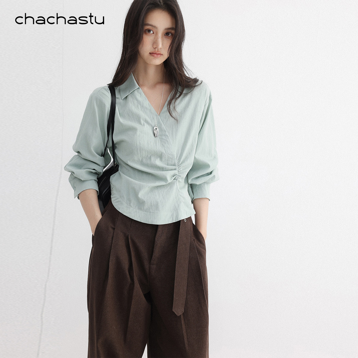 CHACHASTU French minimalist irregular slanted placket waist long sleeve shirt women's early spring slimming V-neck outer top