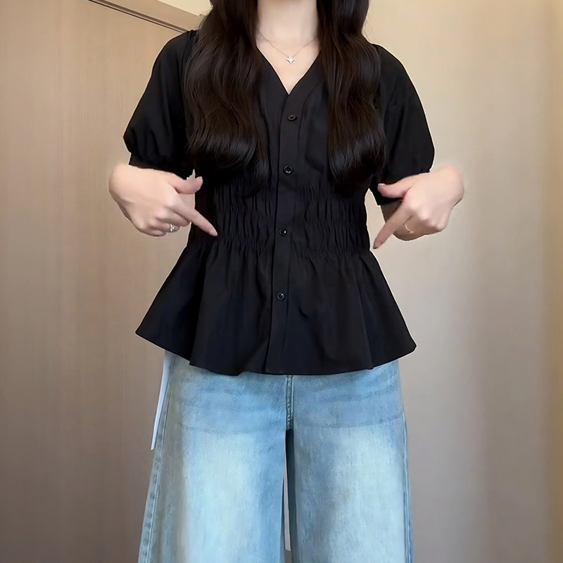 Plus size women's V-neck waist pleated short-sleeved shirt women's summer chubby mm slimming foreign style age-reducing shirt top