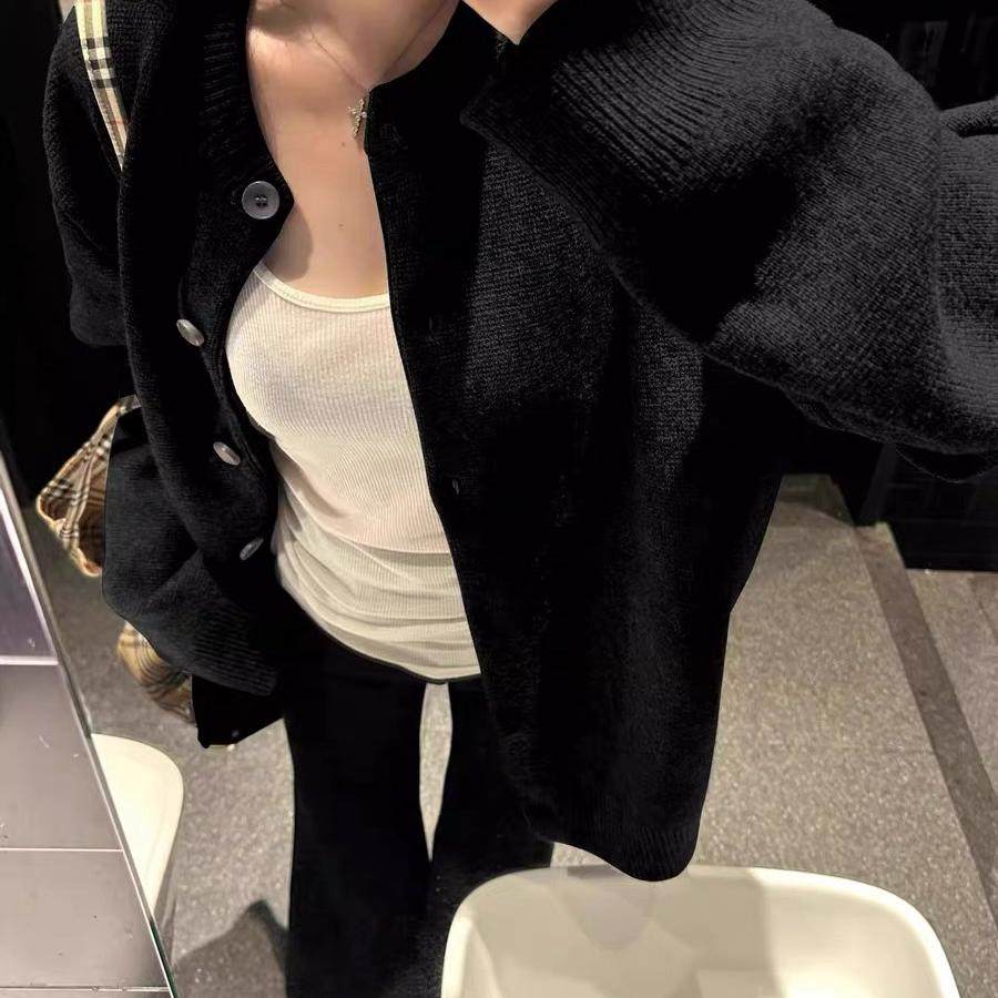 Black lazy style slimming breasted sweater cardigan women's jacket 2025 winter loose large version beautiful chic top