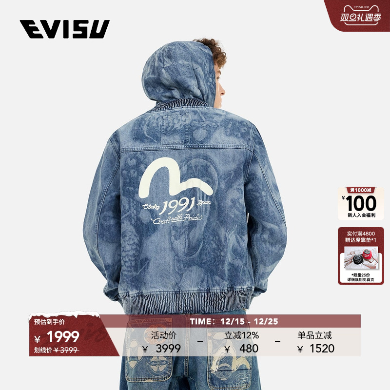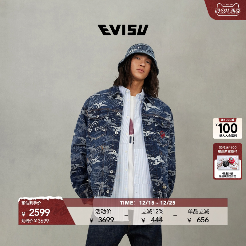 EVISU Autumn 2025 Men's Trend Crane Pattern Lapel Denim Jacket Jacket