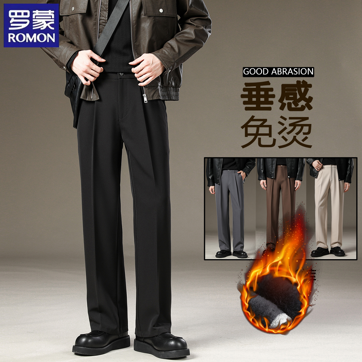 Romon black trousers, men's formal loose straight slacks, business drape, iron-free, cropped suit pants, handsome