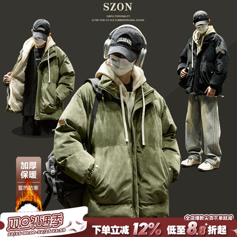 Jacket men's winter thickened warm cotton clothes Japanese retro corduroy bread clothes trendy brand hooded fake two-piece cotton clothes
