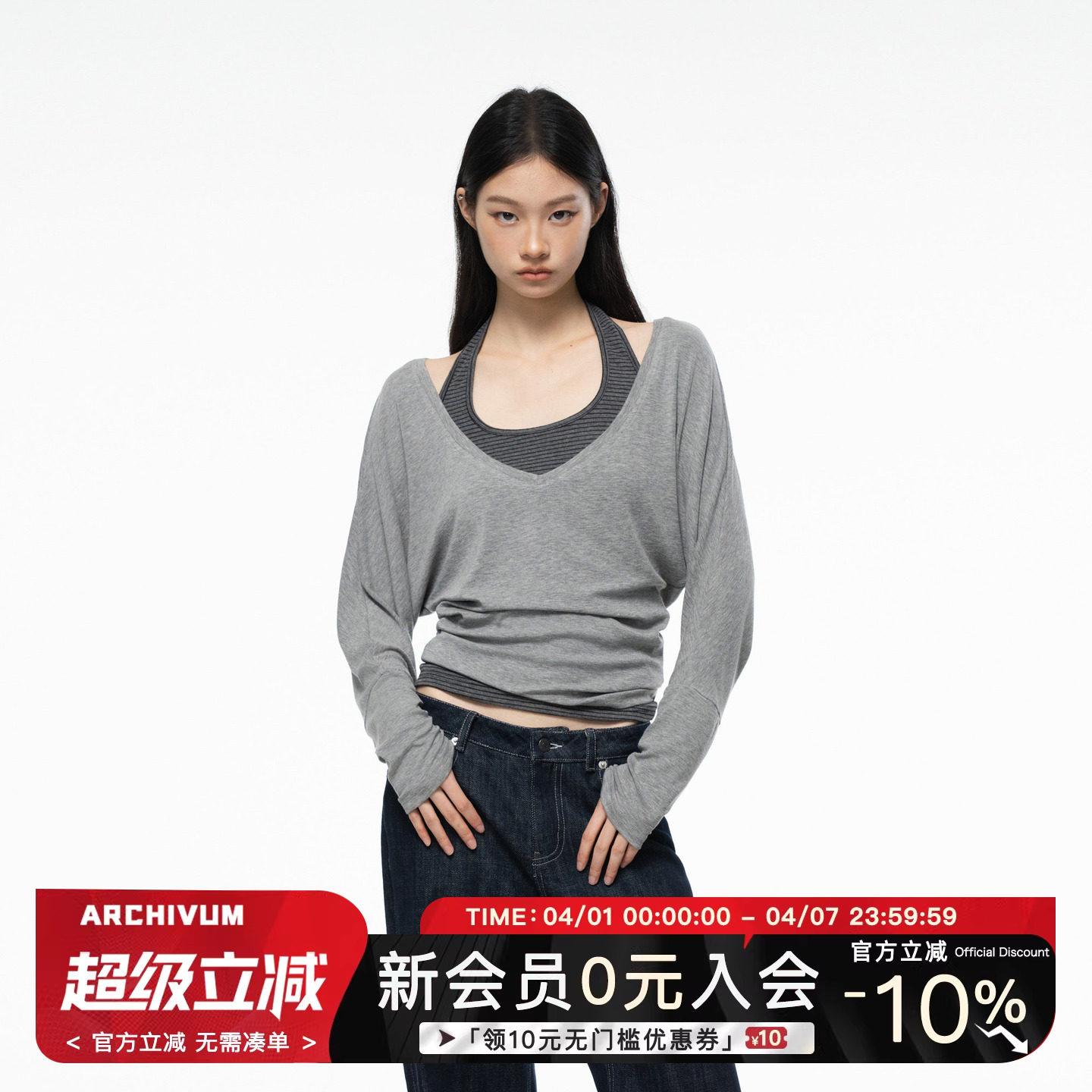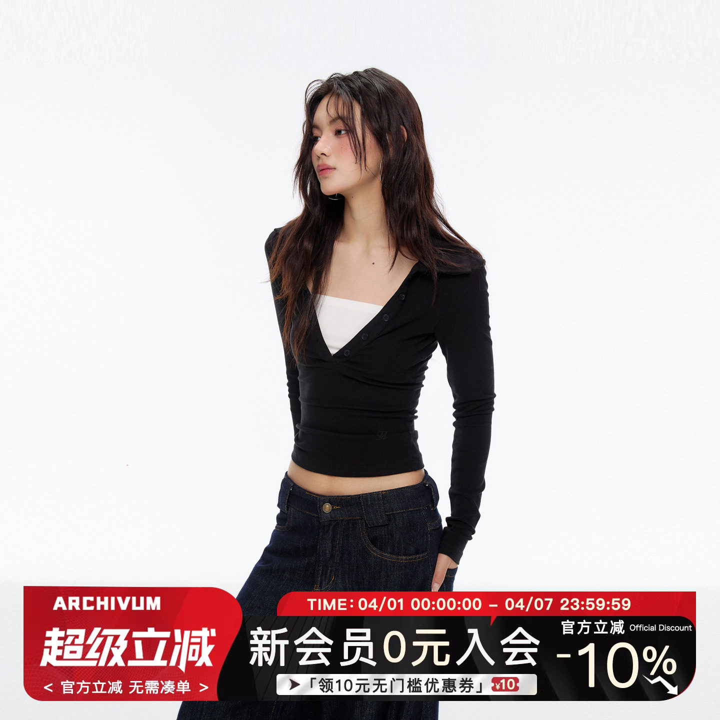 Archivum Fake Two Contrasting Polo Deep V-Neck Knit Long Sleeve Versatile Commuter Slimming Spice Top