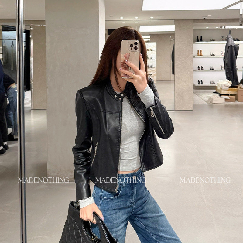 MADE NOTHING leather jacket 005 classic autumn black simple slim fit retro motorcycle zipper jacket jacket for women