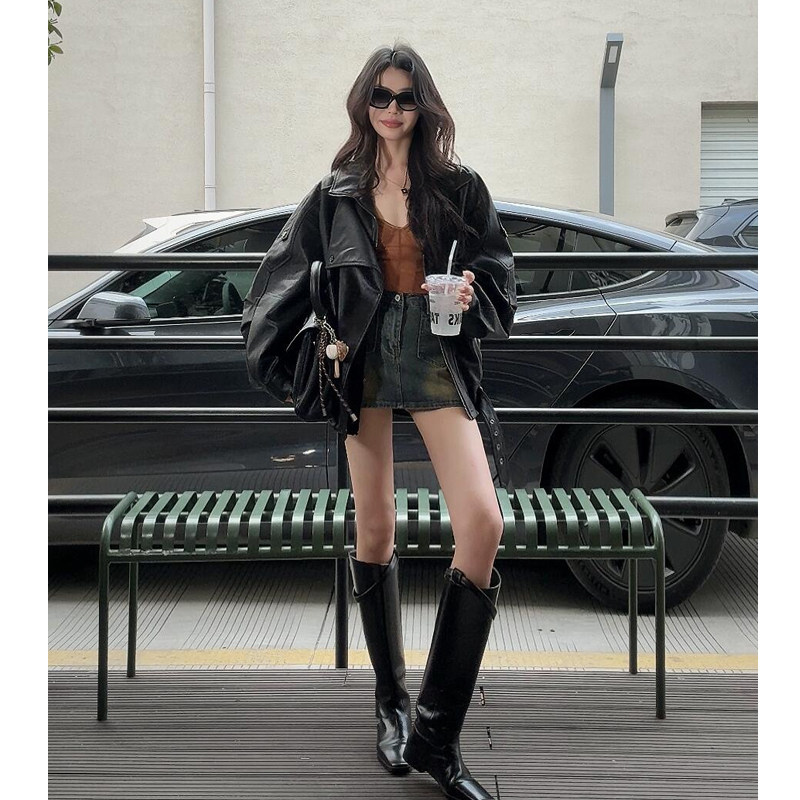 soolrok pine weiyun one Deluna magnetic field retro design sense loose leather jacket women's niche Hong Kong style jacket