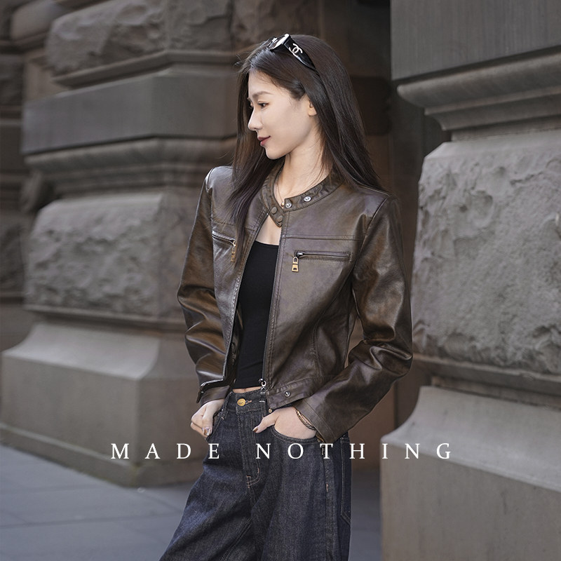 MADE NOTHING leather jacket 010 heavy industry autumn shoulder pads classic short waist washing machine jacket jacket for women
