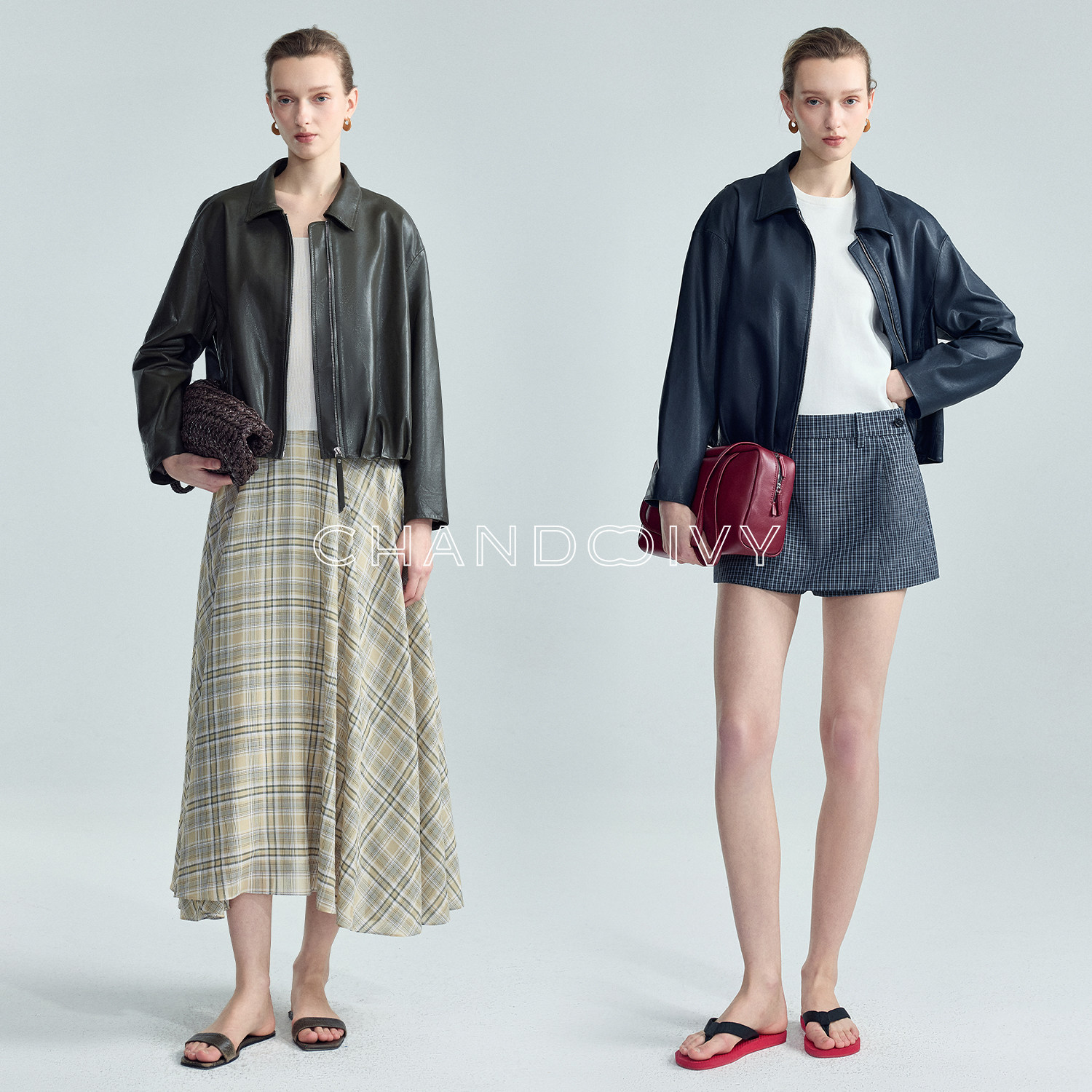 CHANDOOIVY high-quality semi-vegetable-tanned sheepskin pleated deconstructed leather jacket/asymmetrical pleated skirt