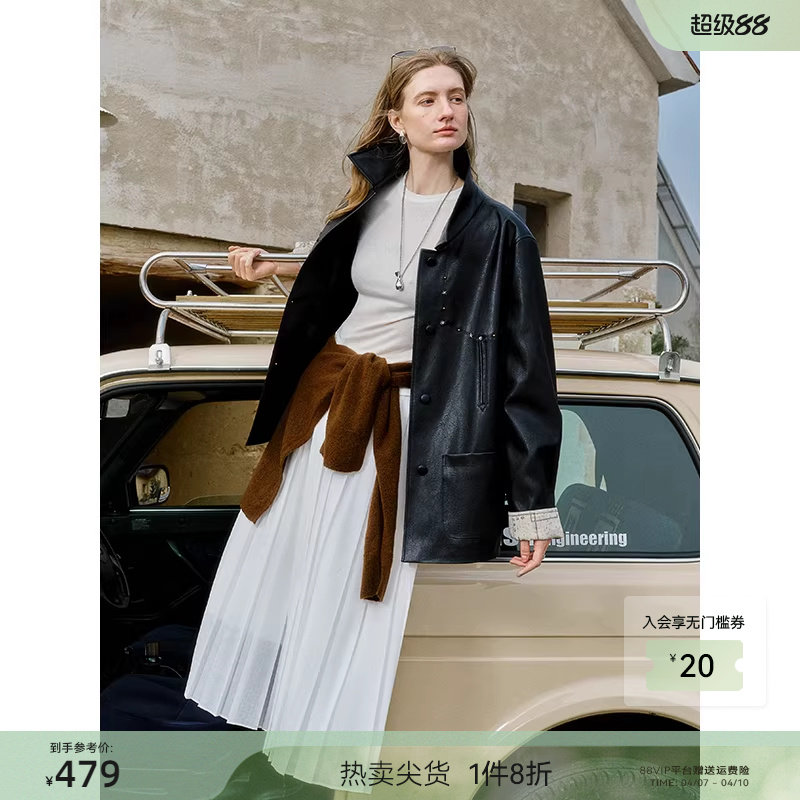 Single bundle women's clothing [retro rivets] loose leather jacket 2026 spring new mid-length fashion lapel temperament jacket