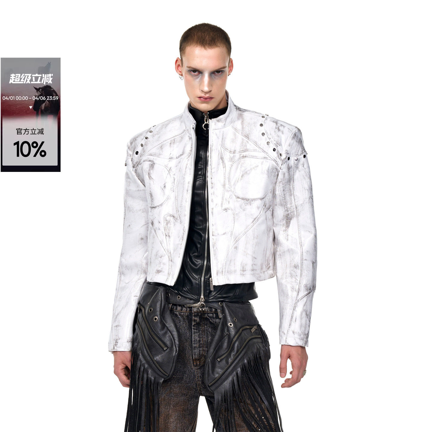 SEE white short stand-up collar leather jacket jacket men's autumn new product shoulder pad leather jacket men's ruffian handsome motorcycle suit trend