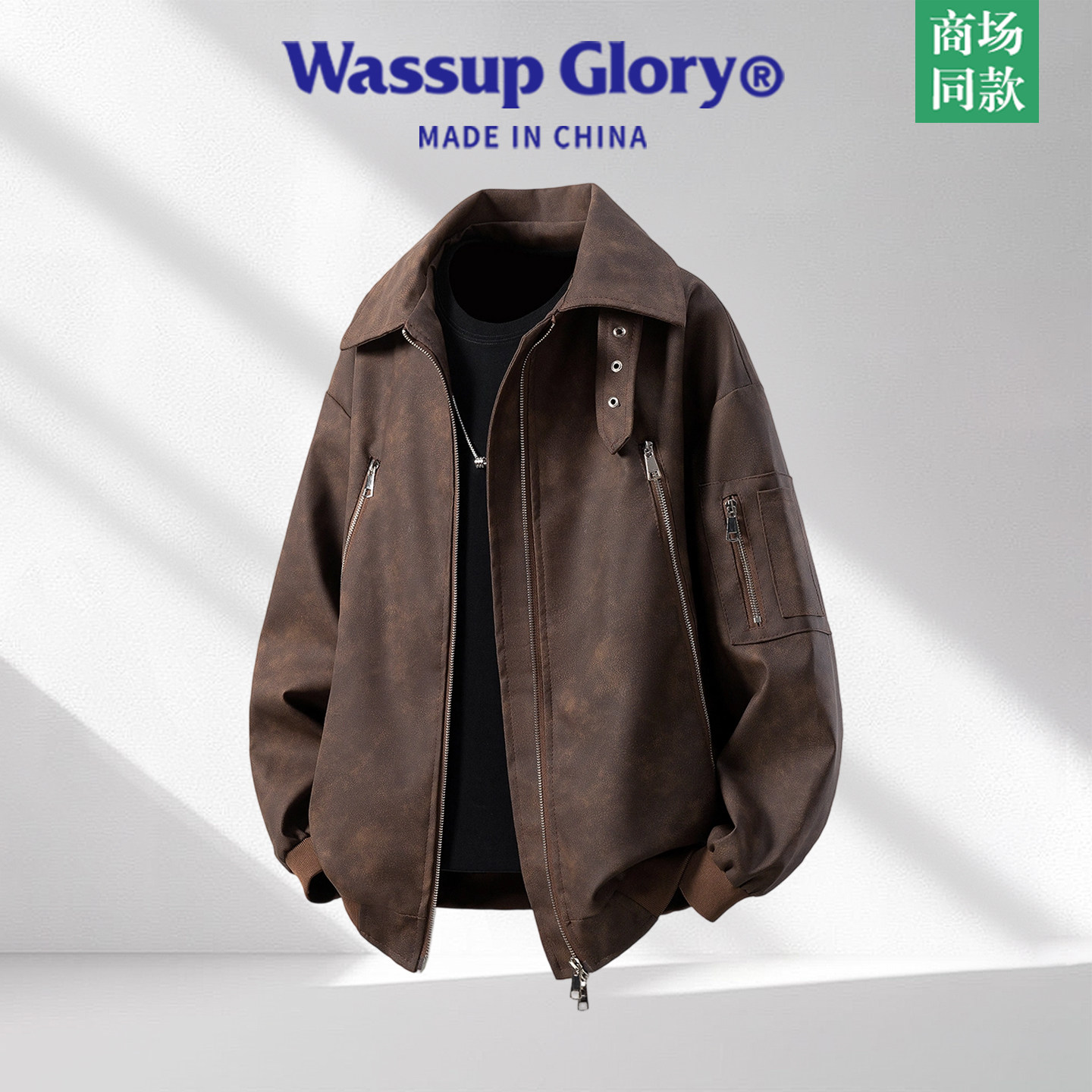 WASSUP GLORY lapel leather jacket men's autumn American motorcycle leather jacket Maillard brown jacket design sense