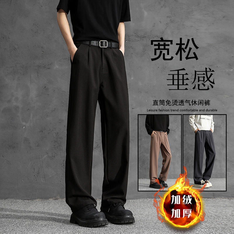 Black straight-leg loose trousers, boys' drape, high-end winter fleece slacks, American high-waisted suit pants