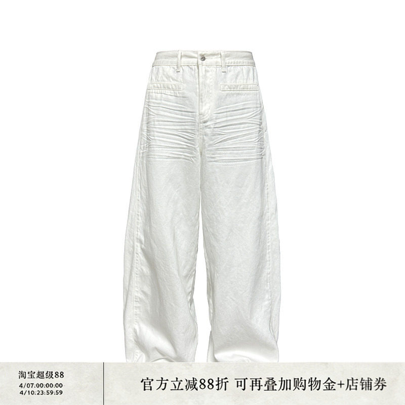 JCAESAR WHITE DENIM pressed white wide-leg jeans three-dimensional scratch cat whiskers baggy version