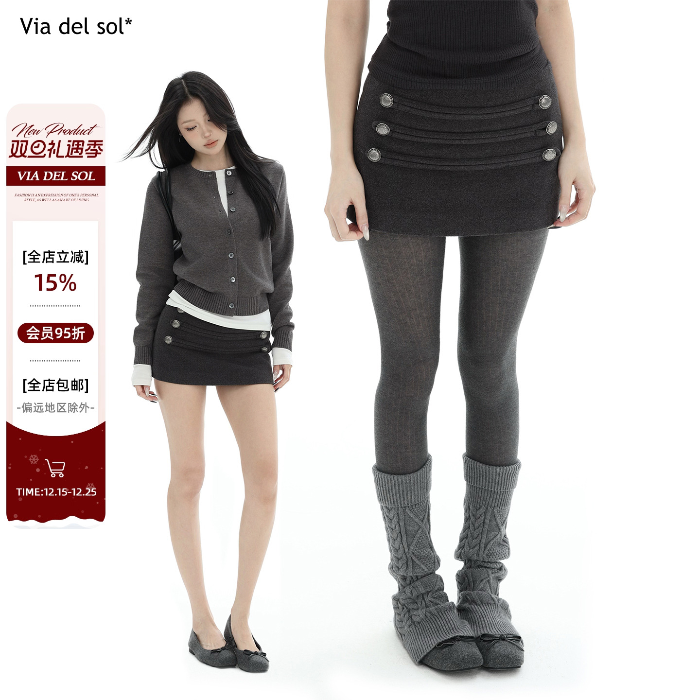 Via del sol Classic heavy industry black woolen skirt women's niche buttonhole design A-line hip skirt